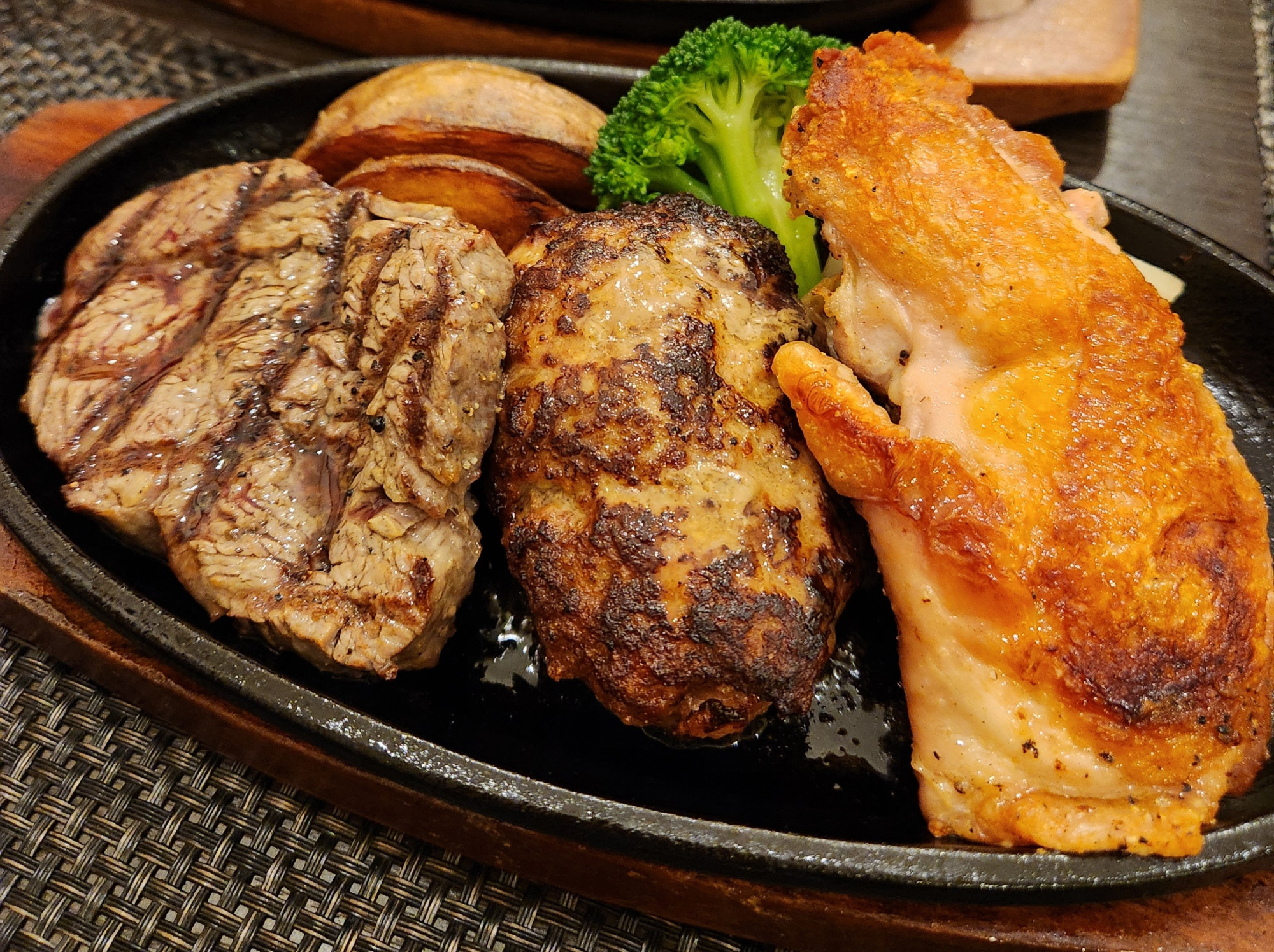 1番人気のハンバーグに、皮パリ、中はジューシーなチキンステーキ、焼き加減抜群の肉々しいステーキが一度に味わえる贅沢なメニューなんです♪