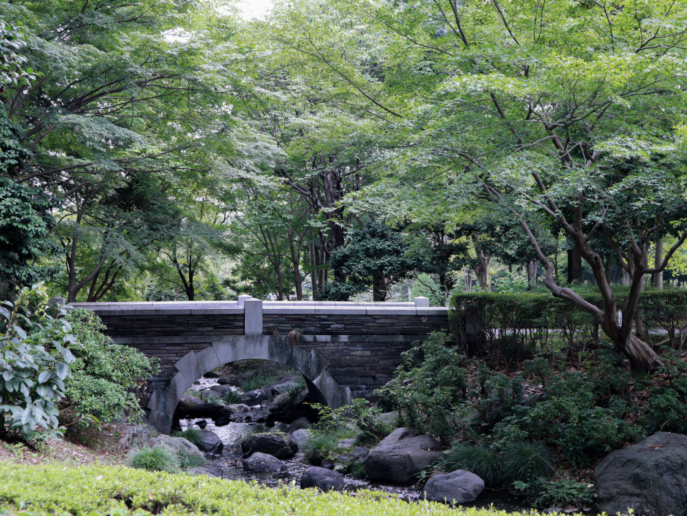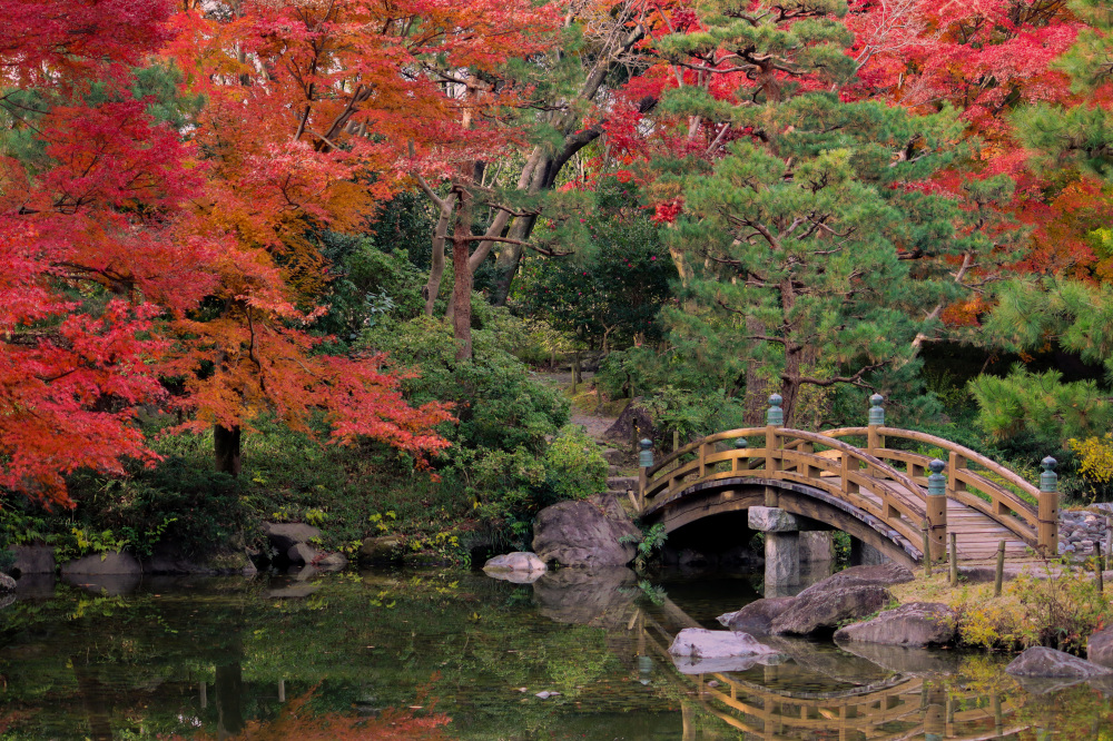 公園奥に広がる日本庭園では、もみじを中心に色鮮やかな紅葉が楽しめます。園内には、ゆったりと流れる川や、日本庭園の象徴「松景橋(しょうけいばし)」があり、「橋と紅葉」「川と紅葉」といった写真映えスポットもたくさん。