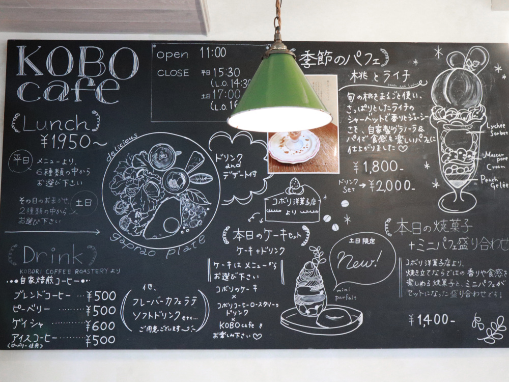 併設されたこちらのカフェでは、コボリ洋菓子店のケーキはもちろん、ランチや季節のフルーツパフェも楽しめます。