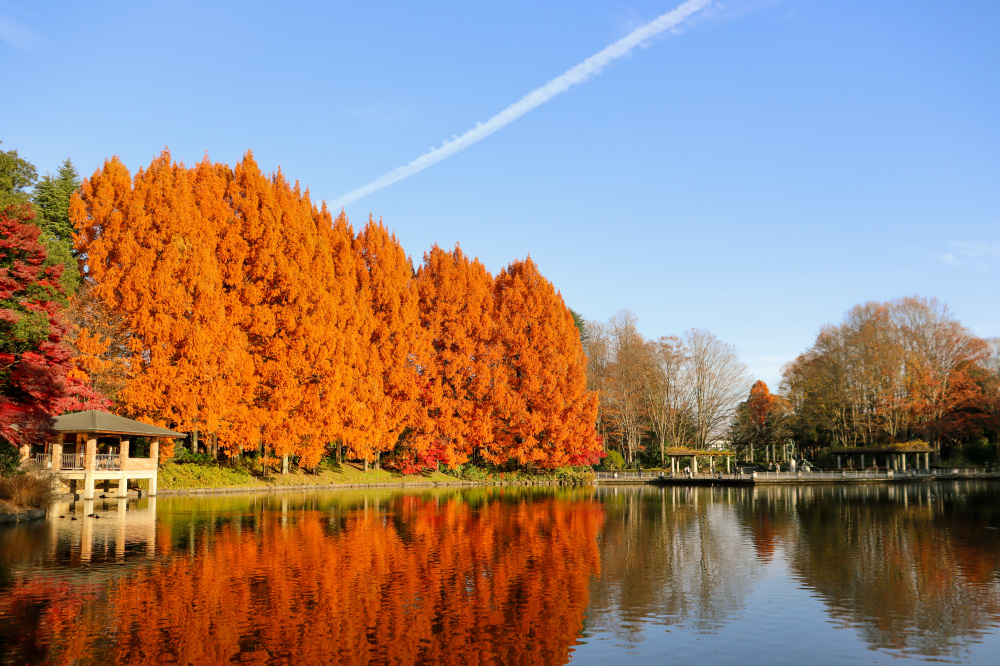 栃木県中央公園の紅葉写真の人気構図といえば、池に映し出されるメタセコイアのリフレクション。大きな池があるからこそ見られるこの美しい光景は必見!水面に映る姿は見事なシンメトリーで、思わず心を奪われます。