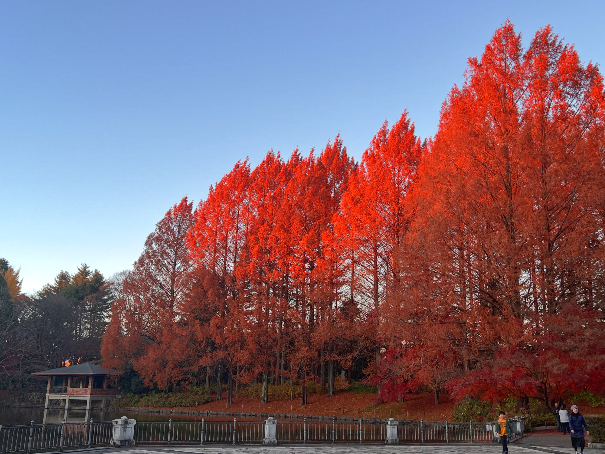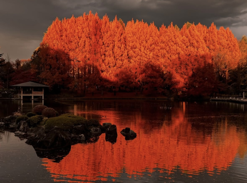 公園管理課の方によると、条件が揃うと夕日に照らされ赤く燃えるようなメタセコイアも撮影できるそうです。この現象は一年にたった数日・ほんの数分しか見られないそうで、とても貴重な瞬間です。