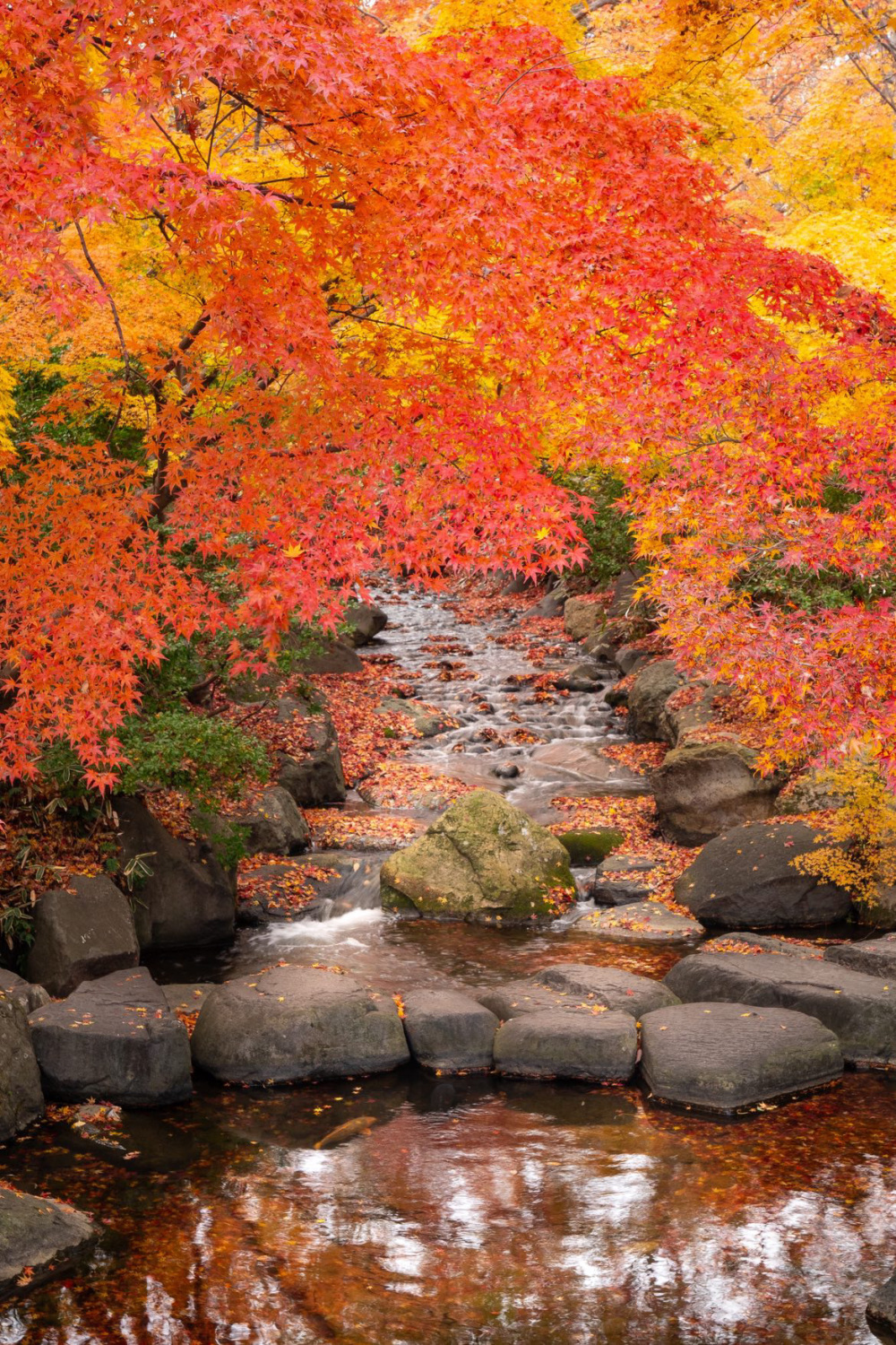 もみじに囲まれた真ん中を川が流れる、自然が生み出したこの美しい構図は、眺めるだけで引き込まれる魅力があります。