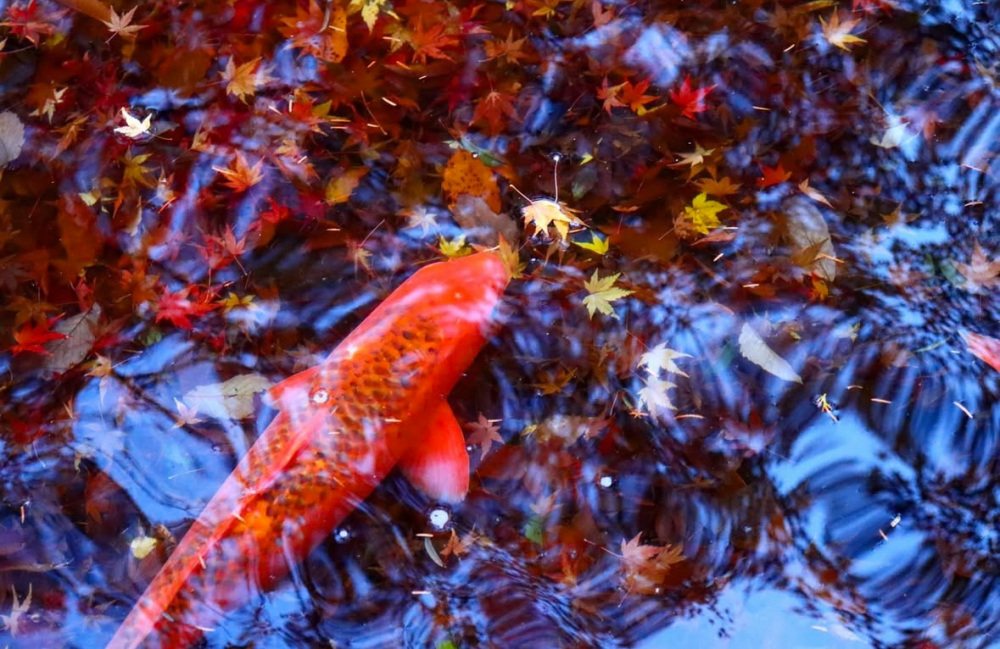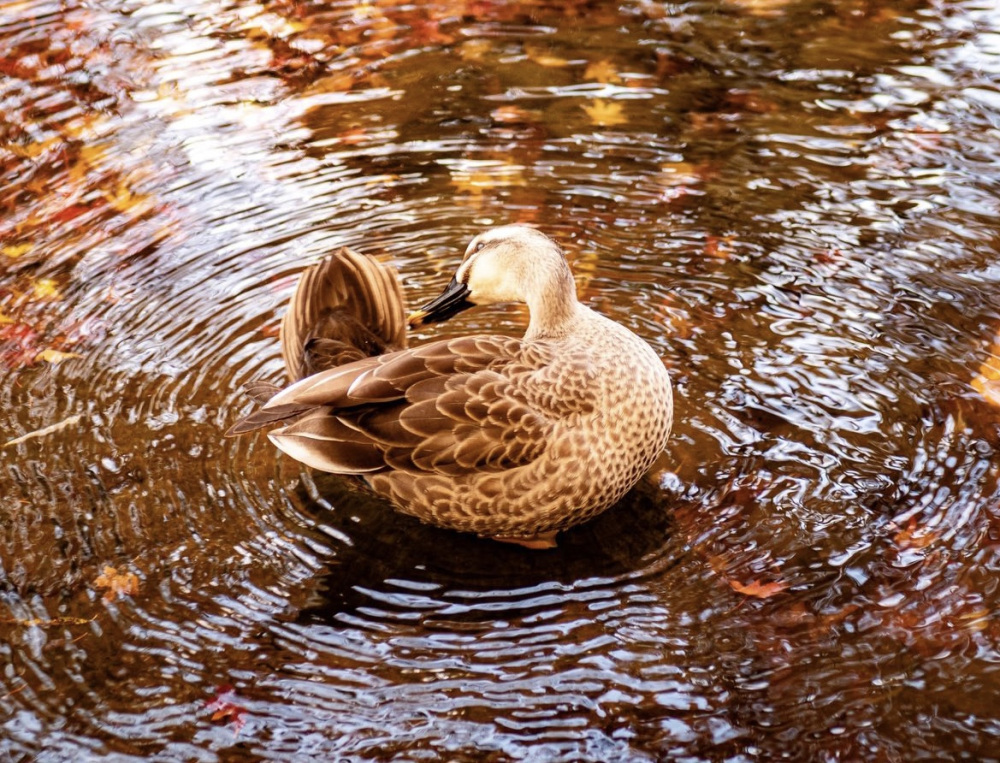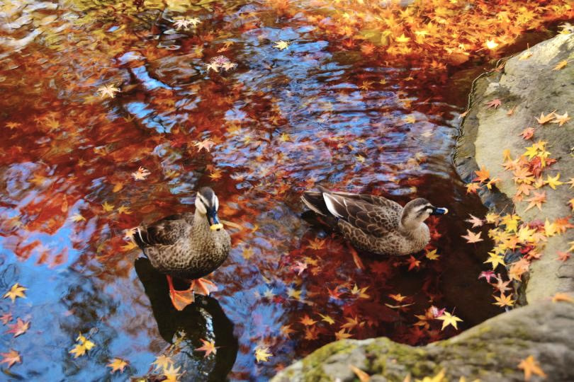 公園内の池には、鯉(コイ)やカルガモ、小鳥などが姿を見せることもあり、タイミングが合えば紅葉と一緒に撮影できるチャンスもあります。