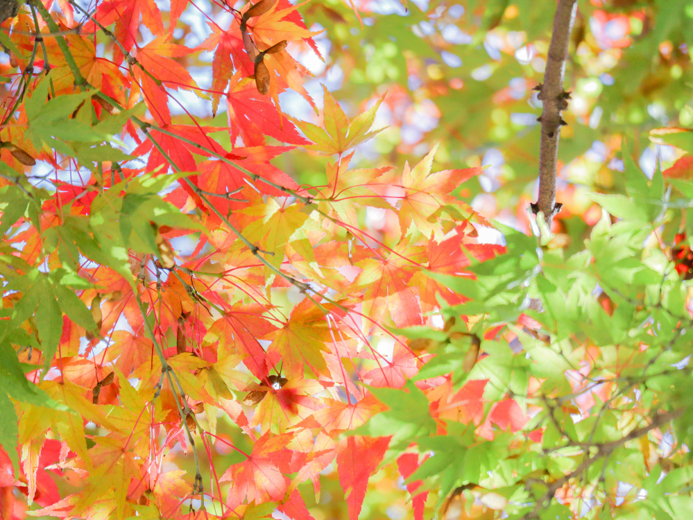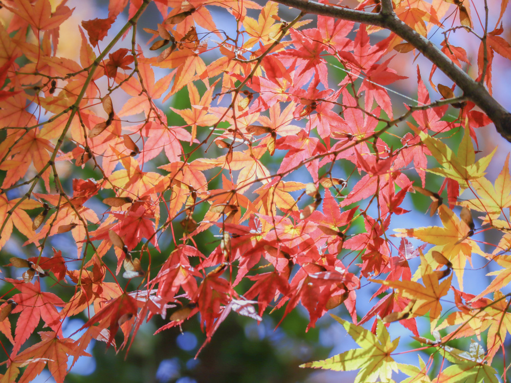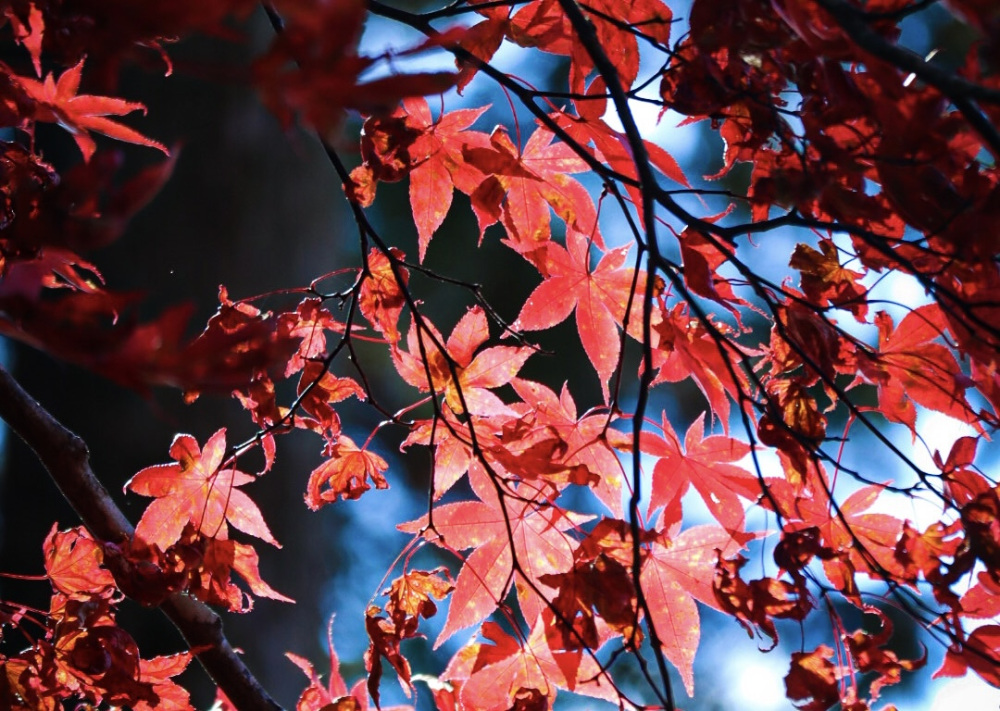 逆光を活かすと多少暗めに写りますが、葉が透けた色合いに注目すると紅葉の色がいっそう引き立ち、ちょっと面白さも感じられます。