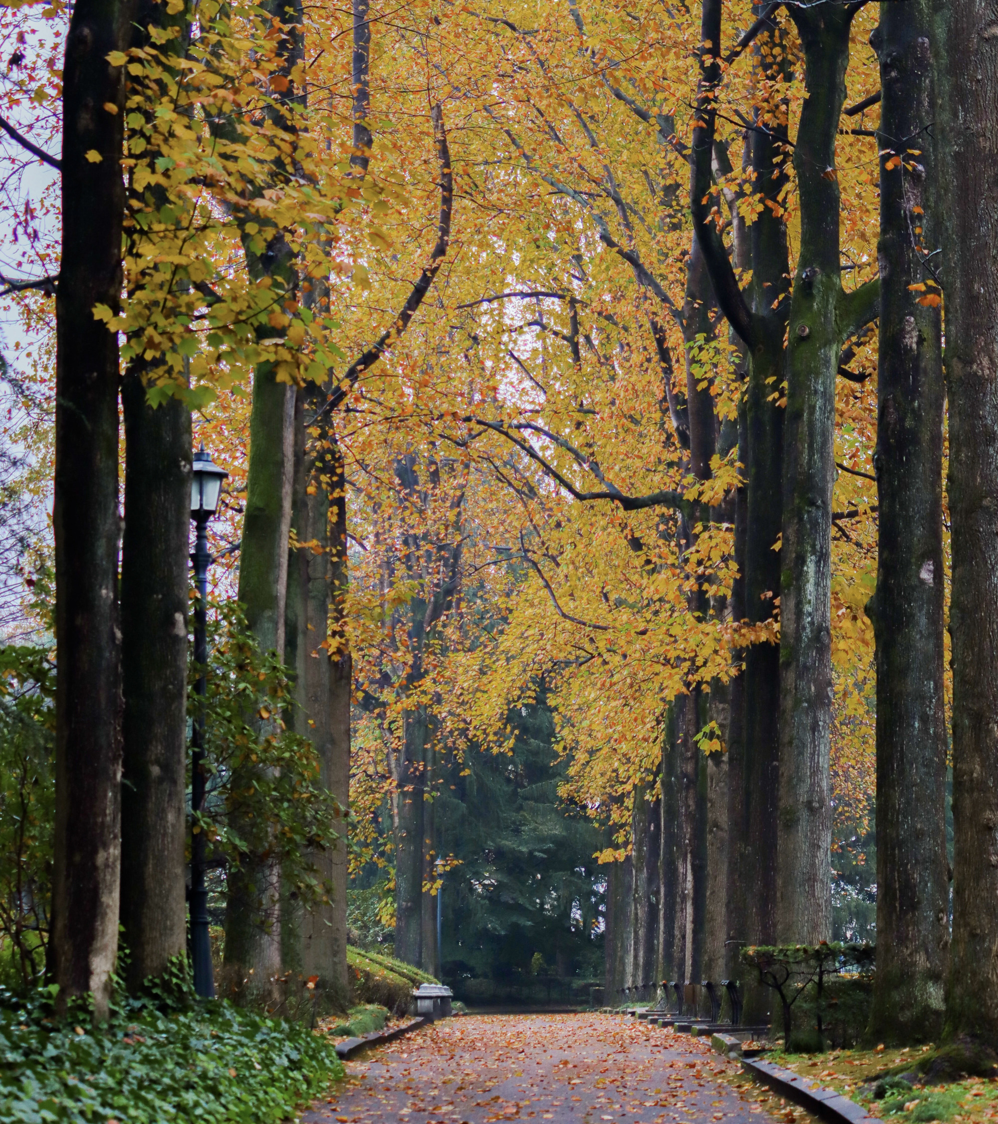 中央公園を訪れると、まず目を引くのが入口から博物館へと続くユリノキの並木道です。約250mまっすぐに伸びる道には背の高い木々が並び、迫力ある光景が広がります。