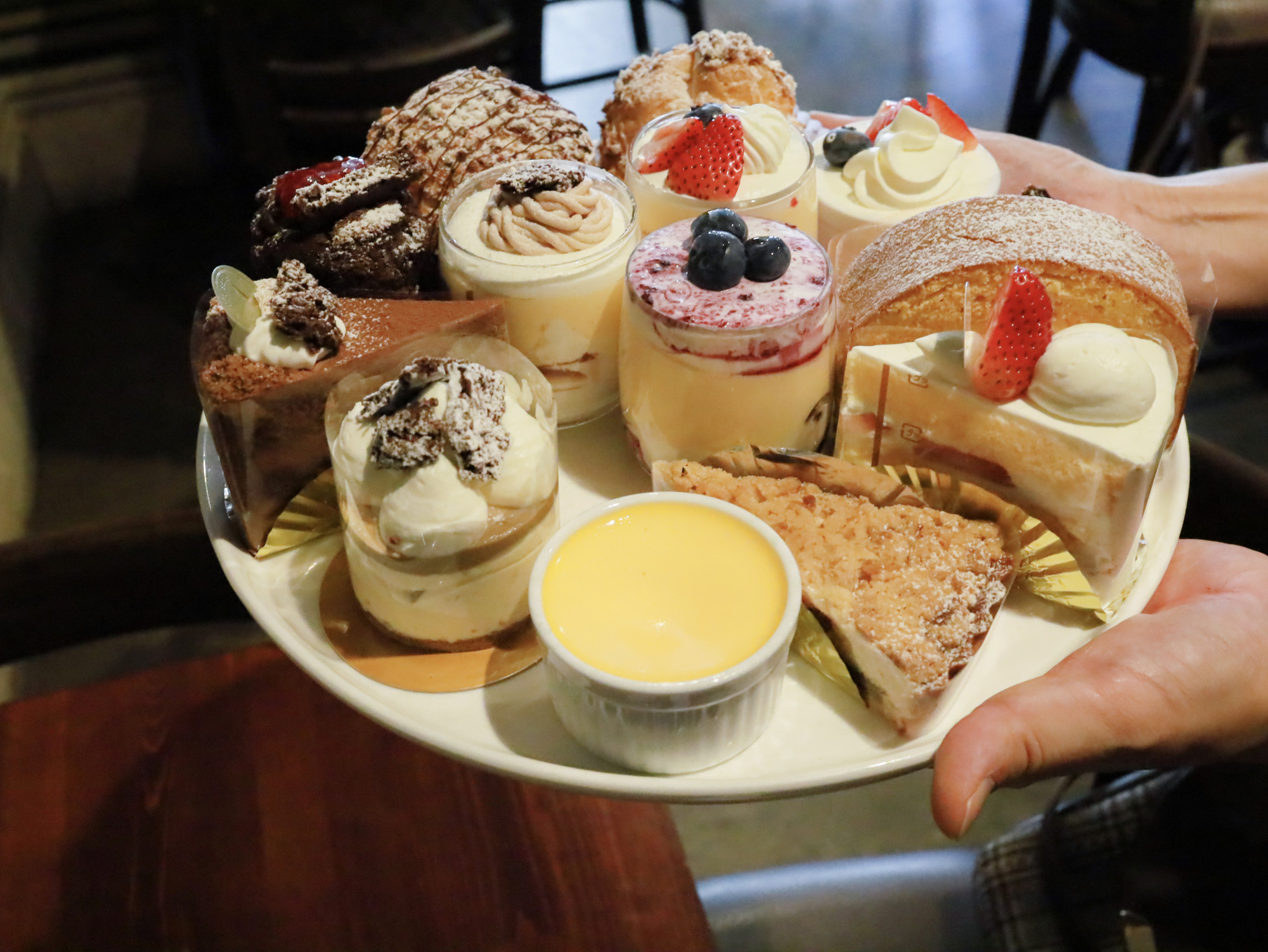スタッフさんが手に持って運んでくれる『ケーキショーケース』にワクワクが止まりません!