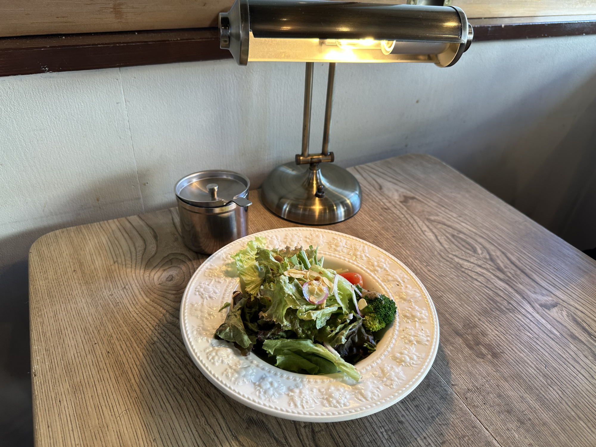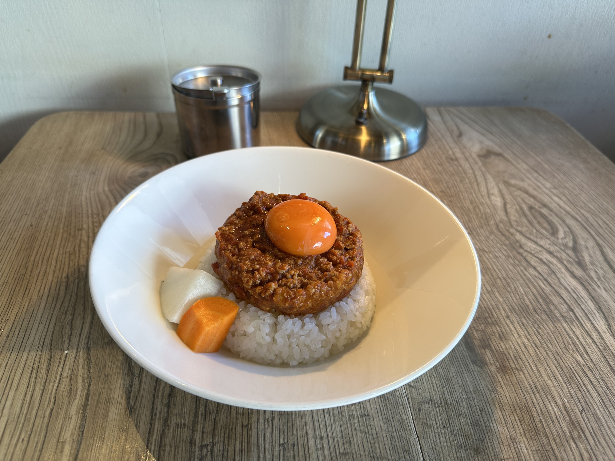 ランチは、前菜(地場野菜のサラダと小さなバーニャカウダ)+メインのお料理(好きなメニューを選べます)+コーヒーorドリンクがセットになってお得にお食事を楽しめます。メインはトマトのキーマカレーを選びました。スパイスがしっかり効いているのに辛すぎず美味しいです。辛いのが少し苦手…な方は、卵黄をかけるとまろやかになるので、お好みに合わせて楽しんでください。