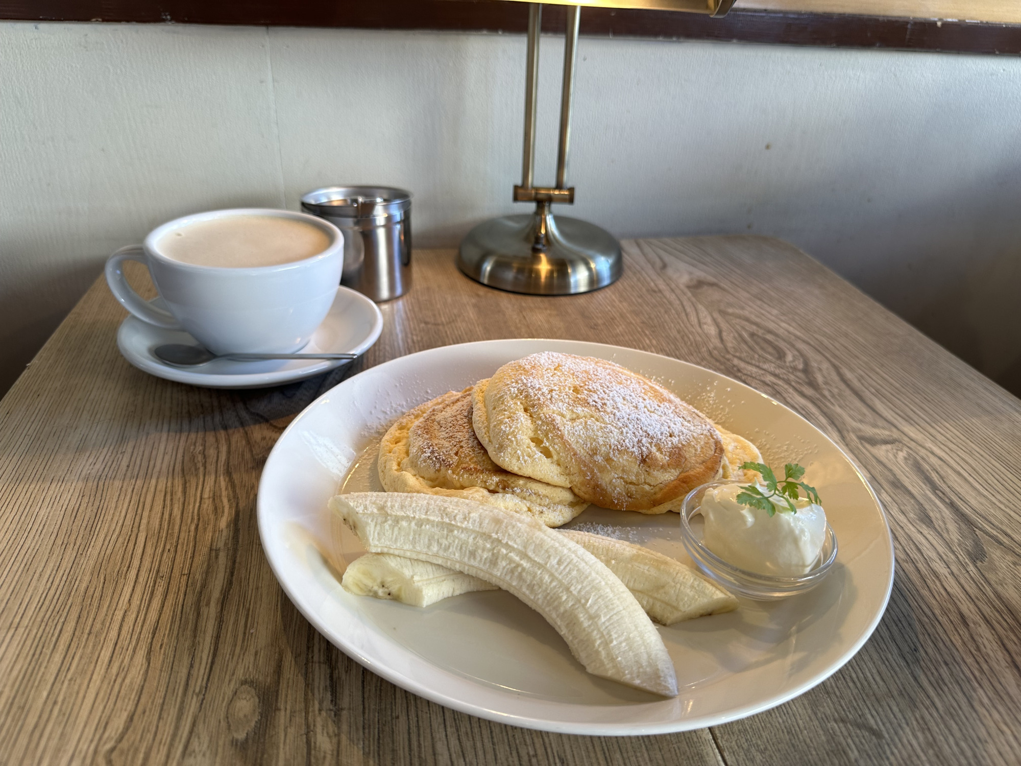 パンケーキは、注文してからメレンゲを立てじっくり焼き上げているため提供まで30分ほどかかるとの事。ふわっふわの焼き立てパンケーキが食べられるので待つ価値アリ!です。添えられたバナナとホイップバターをのせ、メイプルシロップをかけていただくパンケーキは、ちょうど良い甘さでパクパク食べ進められるので気づいたら完食していました。ドリンクも提供タイミングを指定できるので、シーンや好みに合わせて利用しやすいポイントですね。