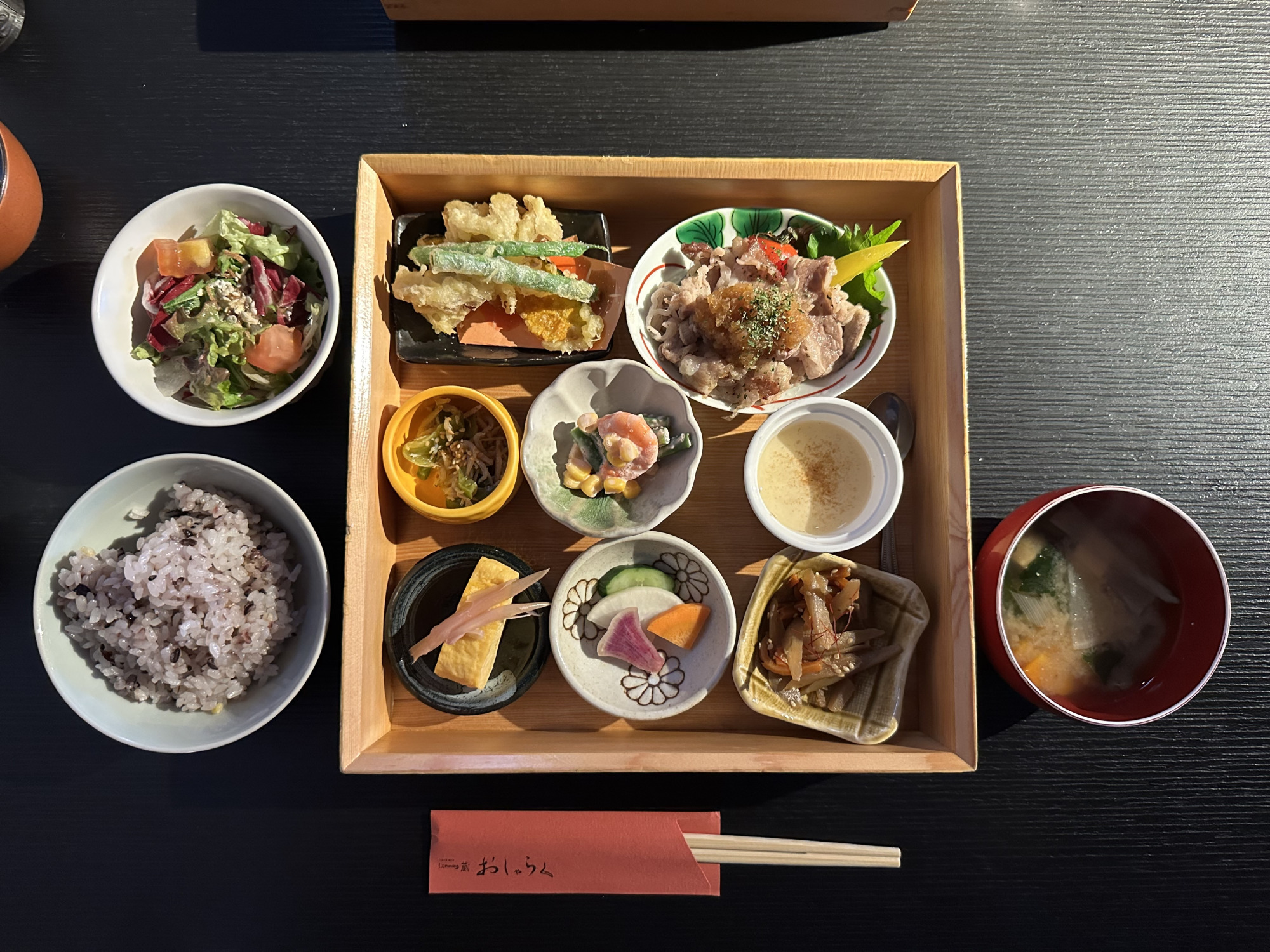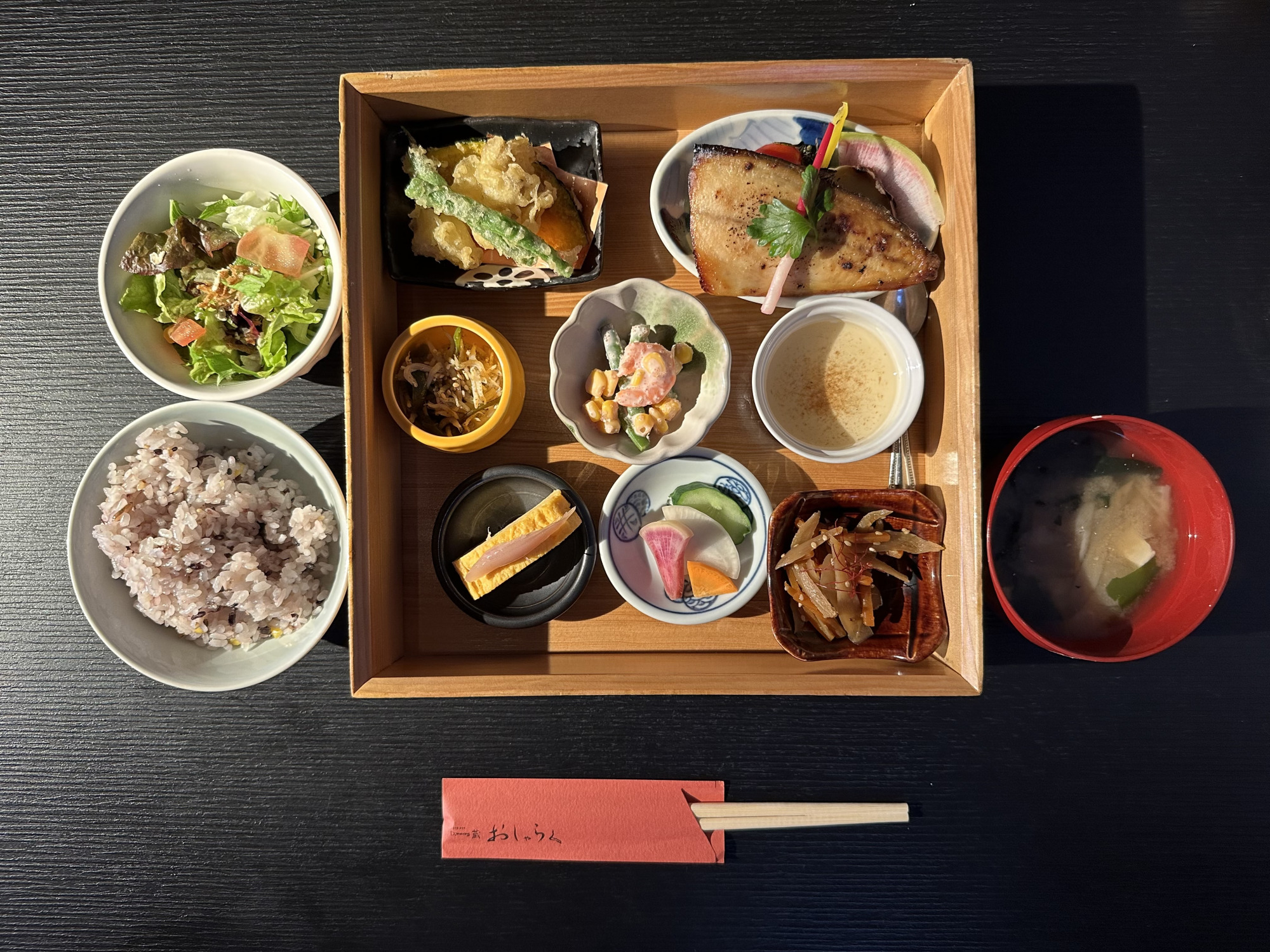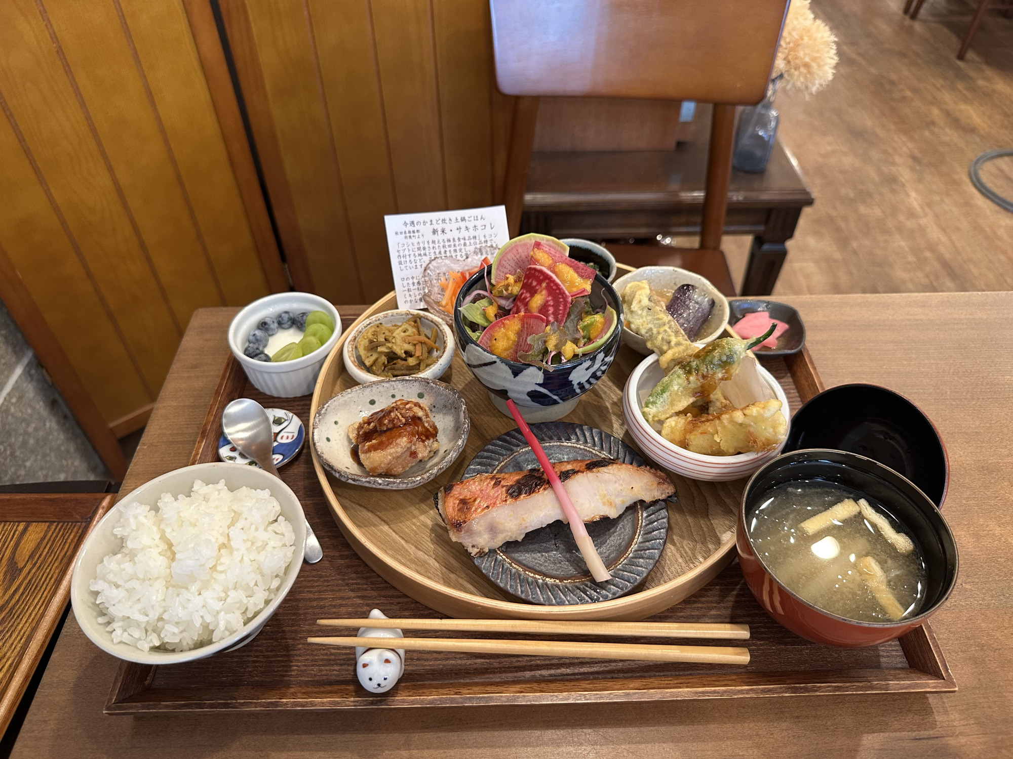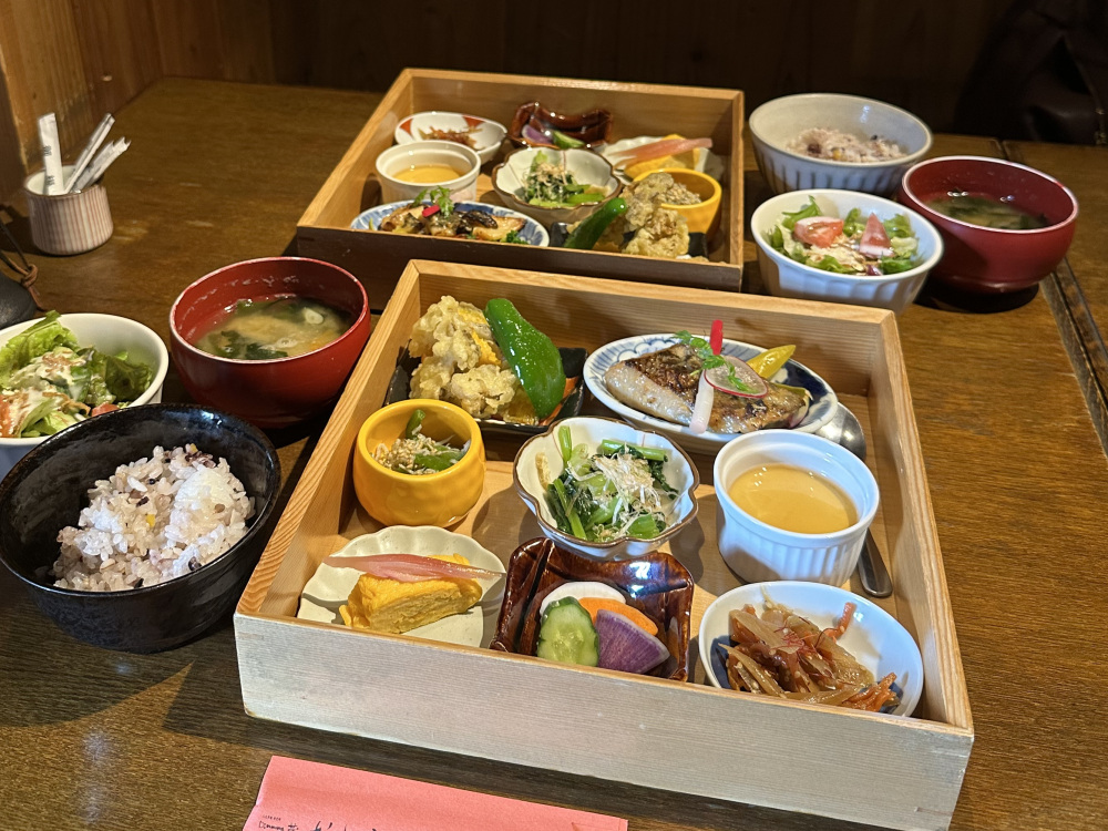 こちらは、工芸品の「曲げわっぱ」のお盆にお野菜・お魚・お肉・プチデザートを盛り込んだメニューで、お好みのお魚をメニュー内から選ぶ事ができます。写真は「銀鱈の西京焼き」です。黒酢あんかけの唐揚げや、ししとう・ごぼう・白身魚の天ぷら他、こだわりの料理が小鉢で並びご飯がすすみます。