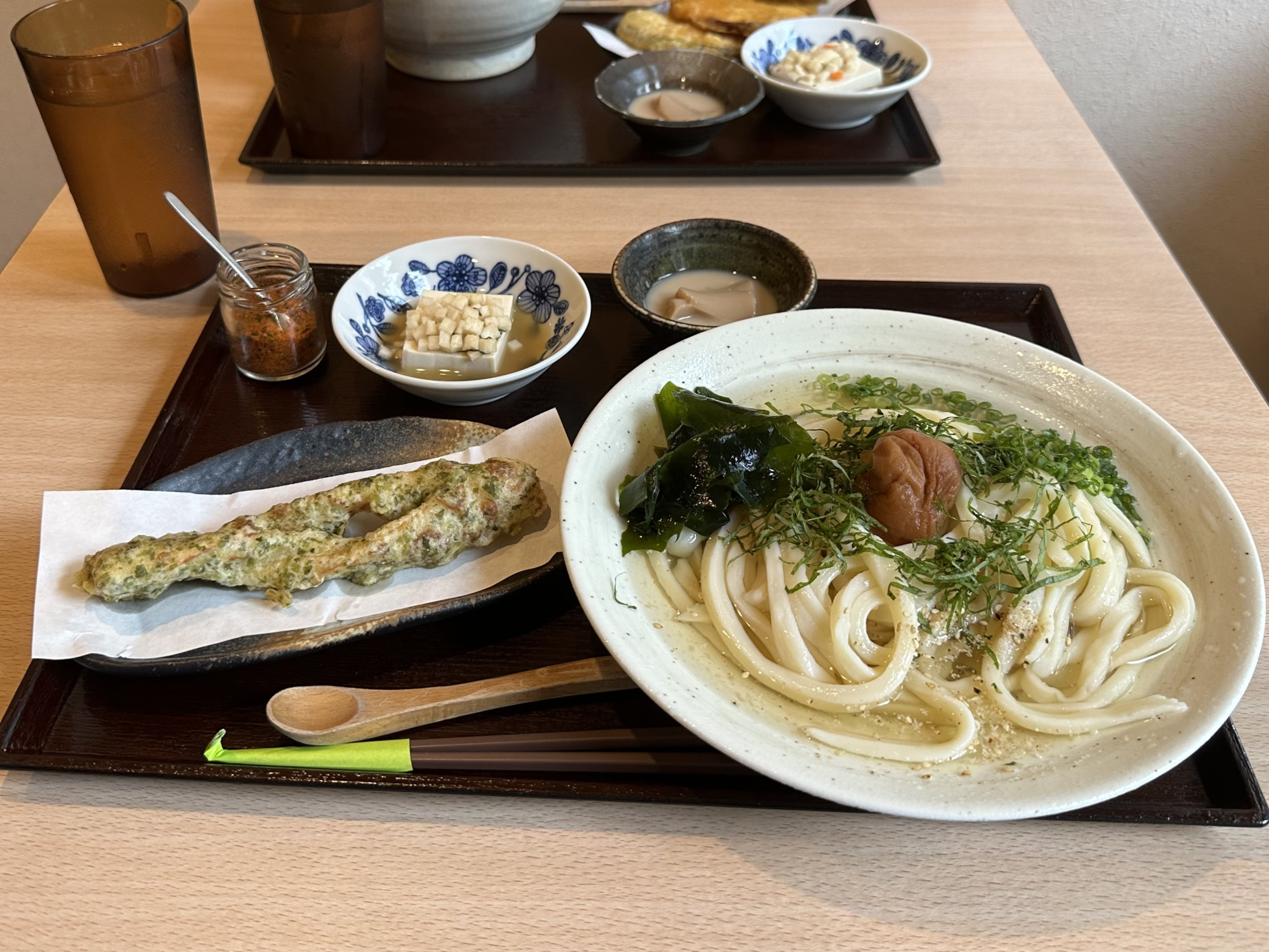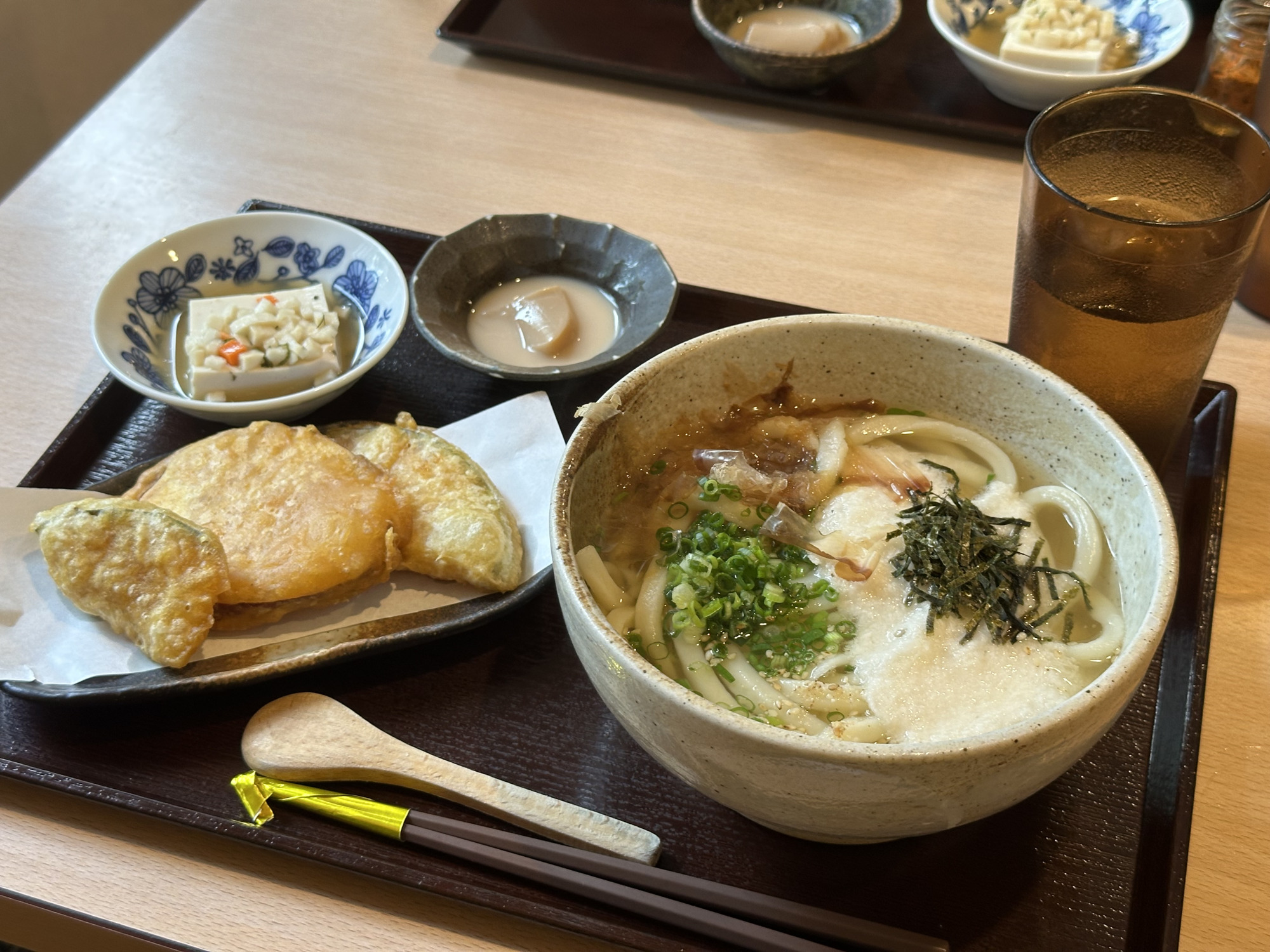 今回注文したのは、「とろろかけうどん(温)」+「かぼちゃと薩摩芋天」、「南高梅しそうどん(冷)」+「ちくわ天」。うどんと天ぷらをセットで注文すると20円引きで、プチデザートが付きお得にお食事できます!