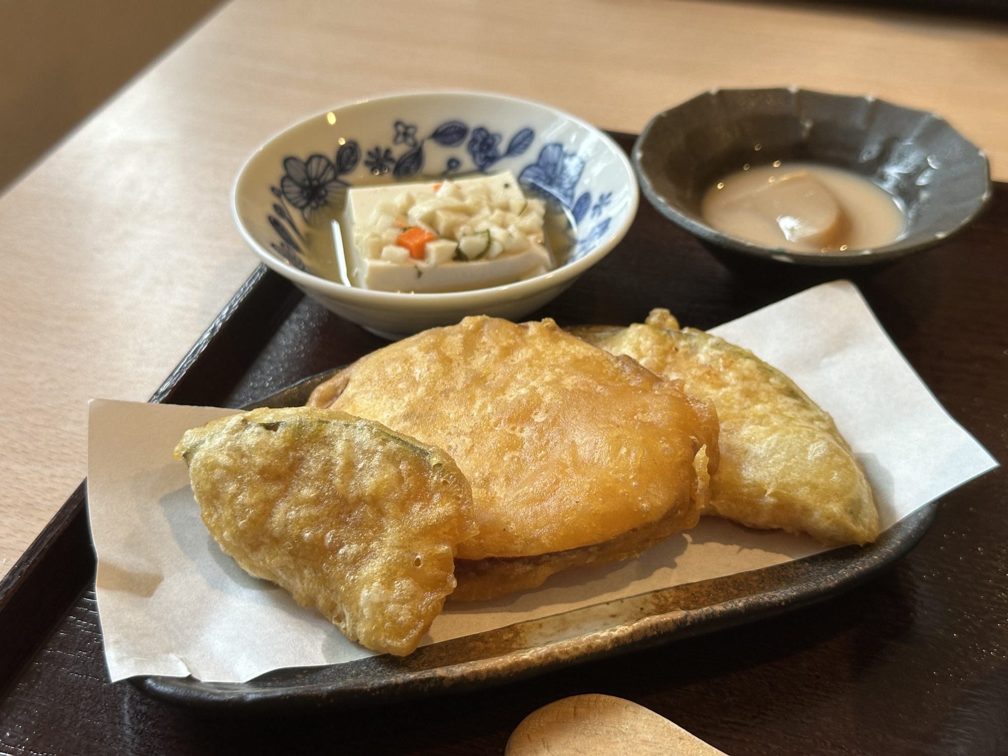 かけうどんのだしは、いりこと鰹節の風味が効いた白色のだしで美味しさと香りが染みます。山芋とだしで喉越しよく食べられます。麺もコシがあり最高で、温かくてもしっかりコシが感じられるのは讃岐うどんならではですね。カボチャと薩摩芋の天ぷらは、カラッと揚がった衣の中にほくほくのお芋で感動しました。