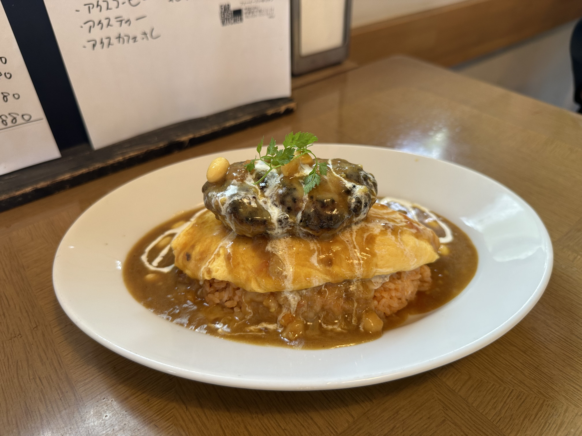 オムライスのメニューは3種類で「ハンバーグのせオムライス(チーズカレーソース又はデミソース)」と「ビーフチーズカレーオムライス」と「オムライス」から選べます。