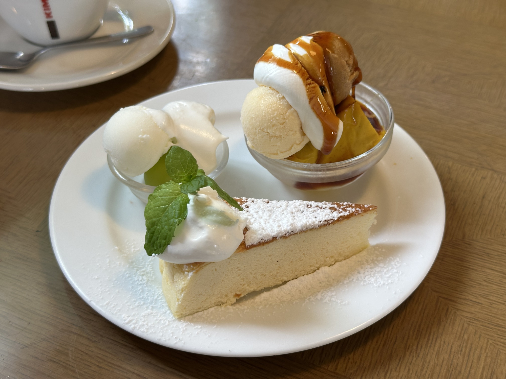 写真はチーズケーキとかぼちゃプリンで、メニューから好きなデザートを選ぶことができます。デザートは1種類でも、2種類ハーフサイズでも料金が変わらないので、色んなデザートを楽しみたい皆さん(花歌もその1人)凄く嬉しいポイントですよね?自家製ジェラートもさっぱり食べられて食後にピッタリでした!