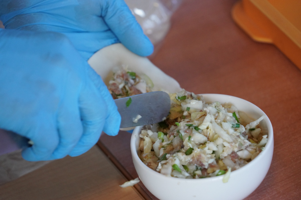 大きなボウルの中に、刻んだキャベツやニラ、ジューシーな豚ひき肉、そこに調味料を加え、しっかりと混ぜ合わせていきます。