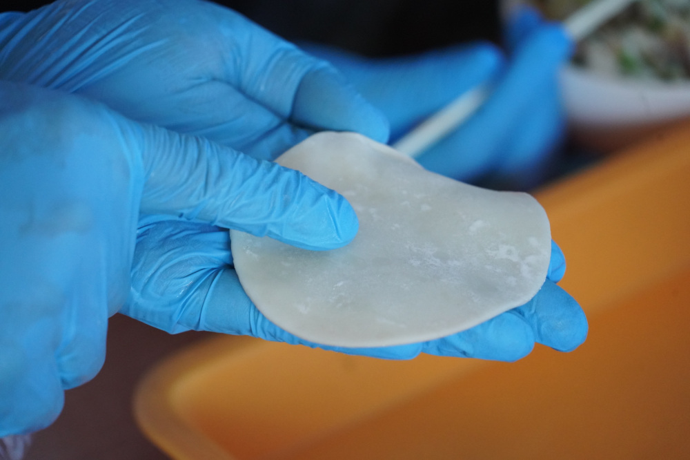 「餃子の皮に裏表はないがですが、打ち粉が多い方を外側にした方がパリッと焼きあがりますよ!」というアドバイスや「皮の縁を水で軽く湿らせると、しっかり閉じられますよ」と一つ一つ教えてもらいながら挑戦します。