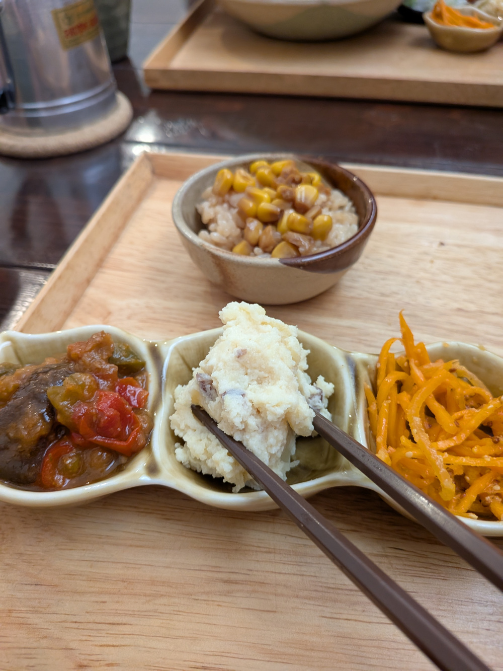 お蕎麦を注文すると、手作りの日替わり前菜3種+ミニご飯が付いてきます。