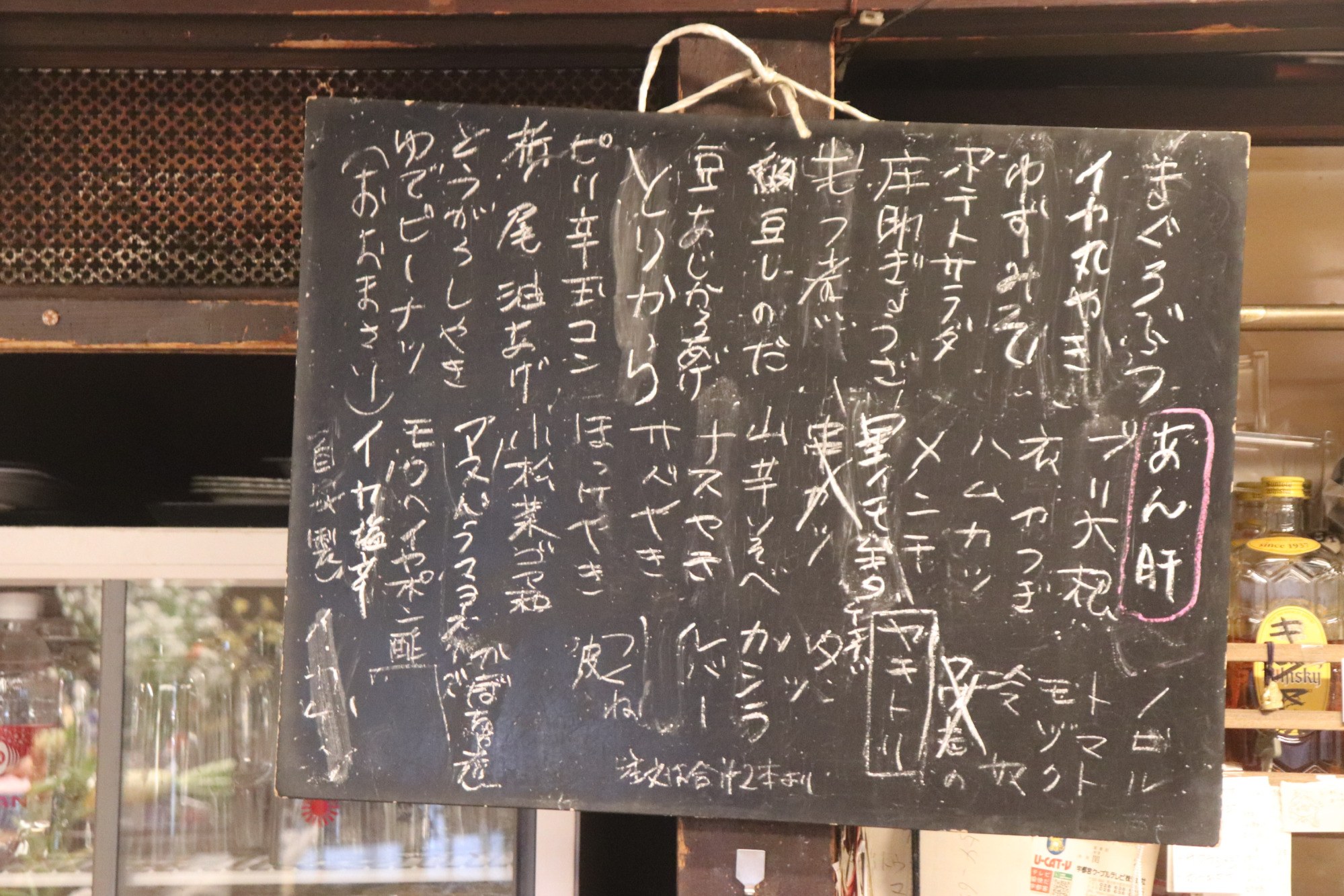 料理のメニューは店内の黒板1枚のみ。入店したらスマートフォンで黒板メニューを撮影して料理を選びましょう。