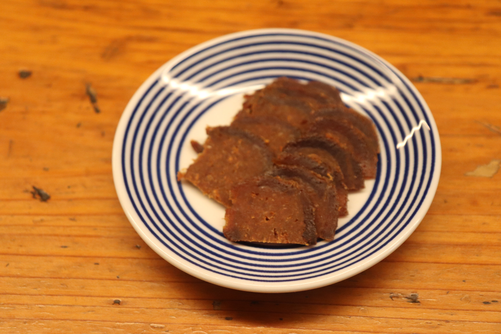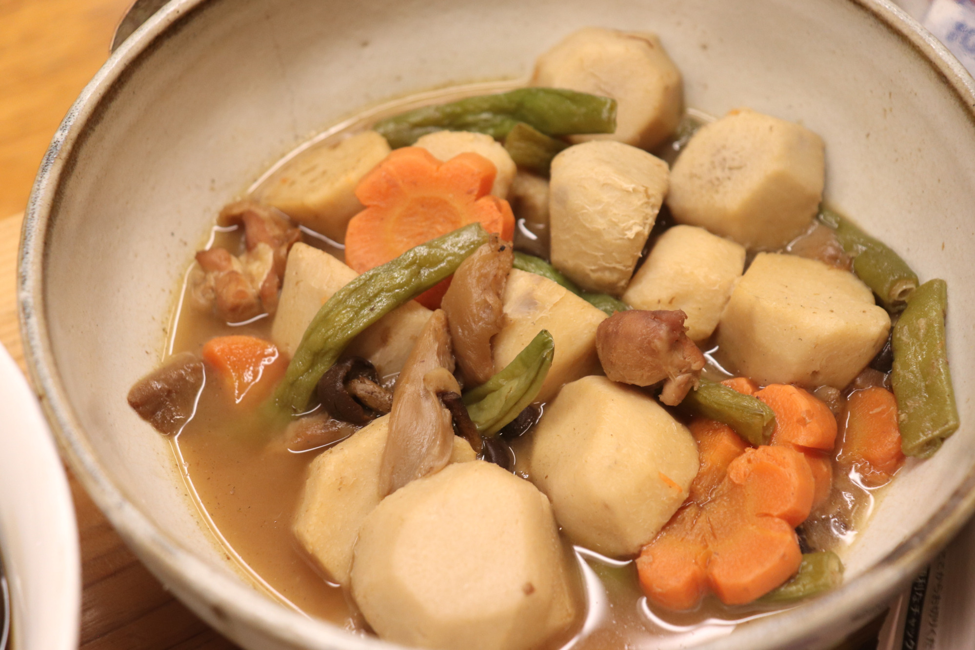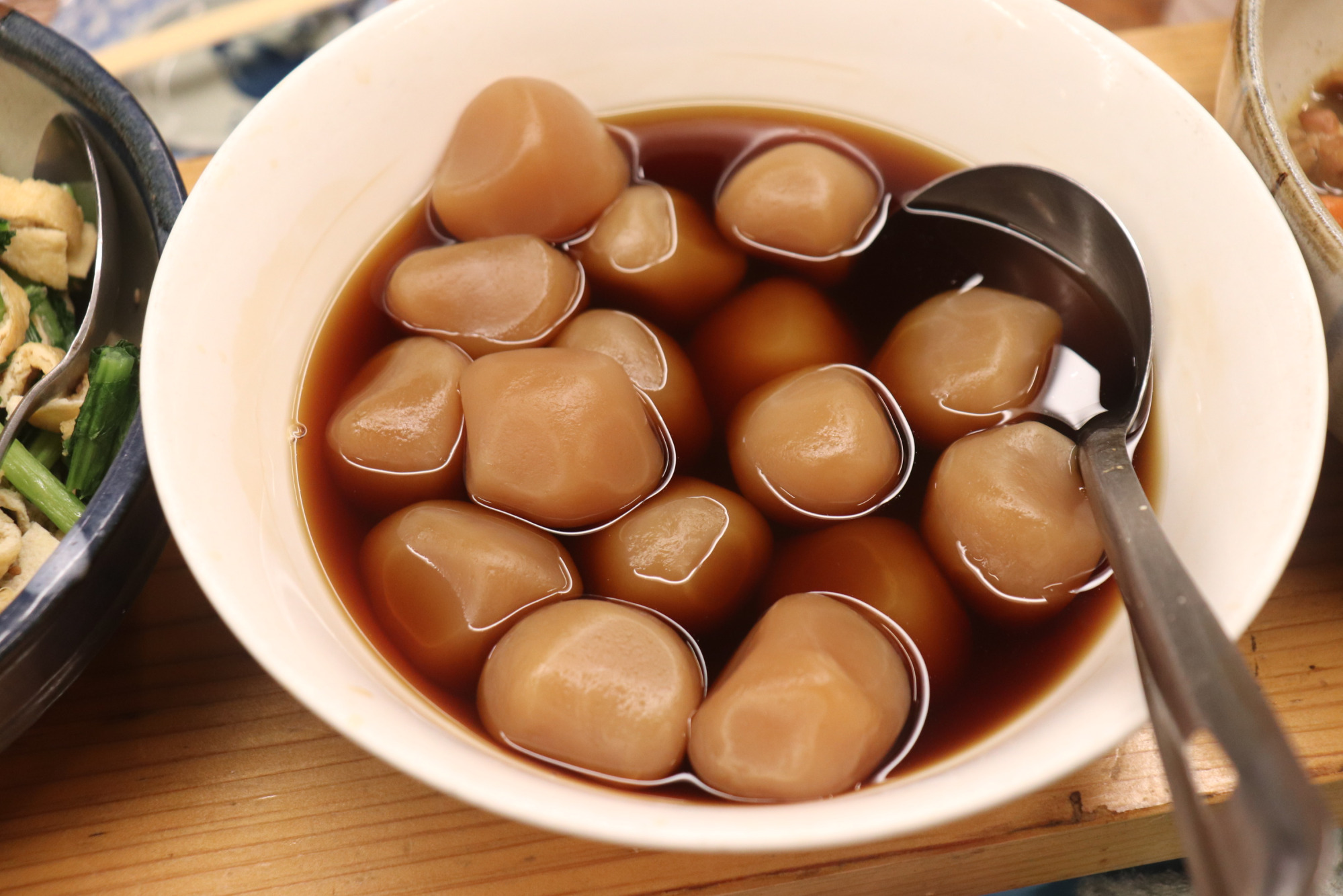 栃木県の代表的な郷土料理で、正月に食べた塩引き鮭の頭や節分に残った煎り豆に、大根、ニンジン、油揚げ、酒粕を煮てから冷やして食べます。見た目があまりよくないことから敬遠する人も多くいますが、ひと口ほおばり、末広の熱燗をグイっとひと呑み。