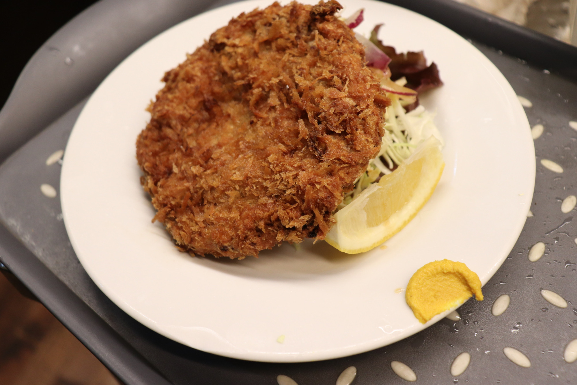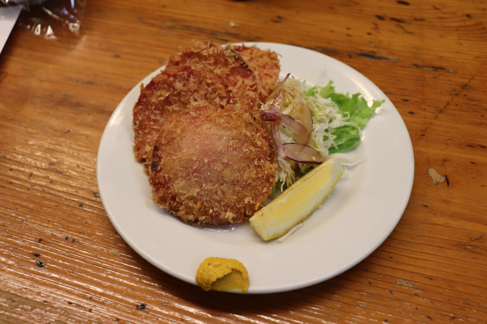 庄助のハムカツはボロニアハムのみを使用しています。薄くスライスしたボロニアハムを薄い衣のパン粉でサクサクに揚げます。サックとした歯ごたえと軽い食感が、生ビールやハイボールに合います。
