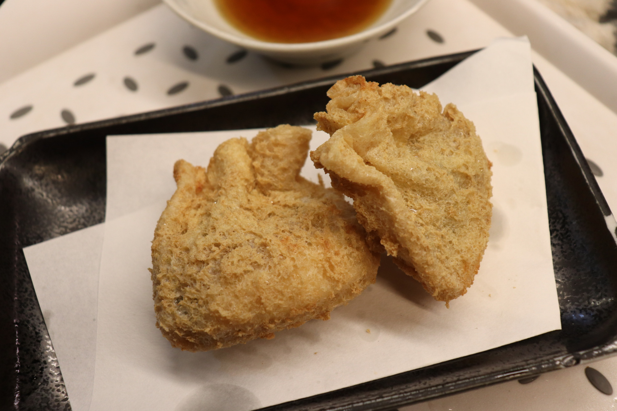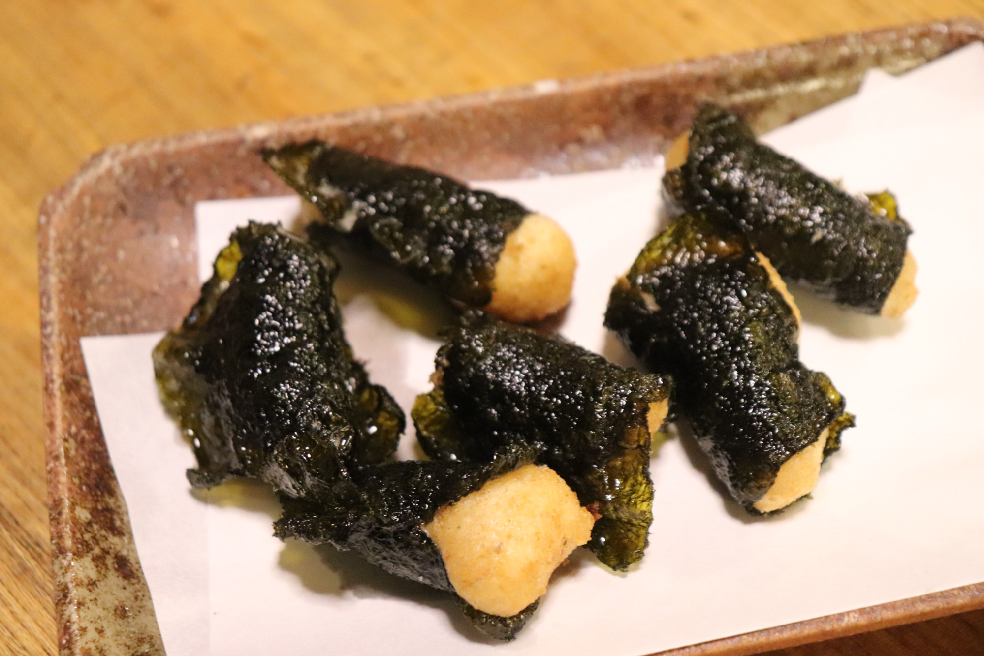 信田と書いて「しのだ」と呼びます。信田とは狐の好物が油揚げという言い伝えから、油揚げを使う料理全般につける名称です。庄助では、裏返した油揚げに刻みネギを和えた納豆とクリームチーズを入れて油で揚げます。揚げたてを温かい醤油ダレに付けて食べます。