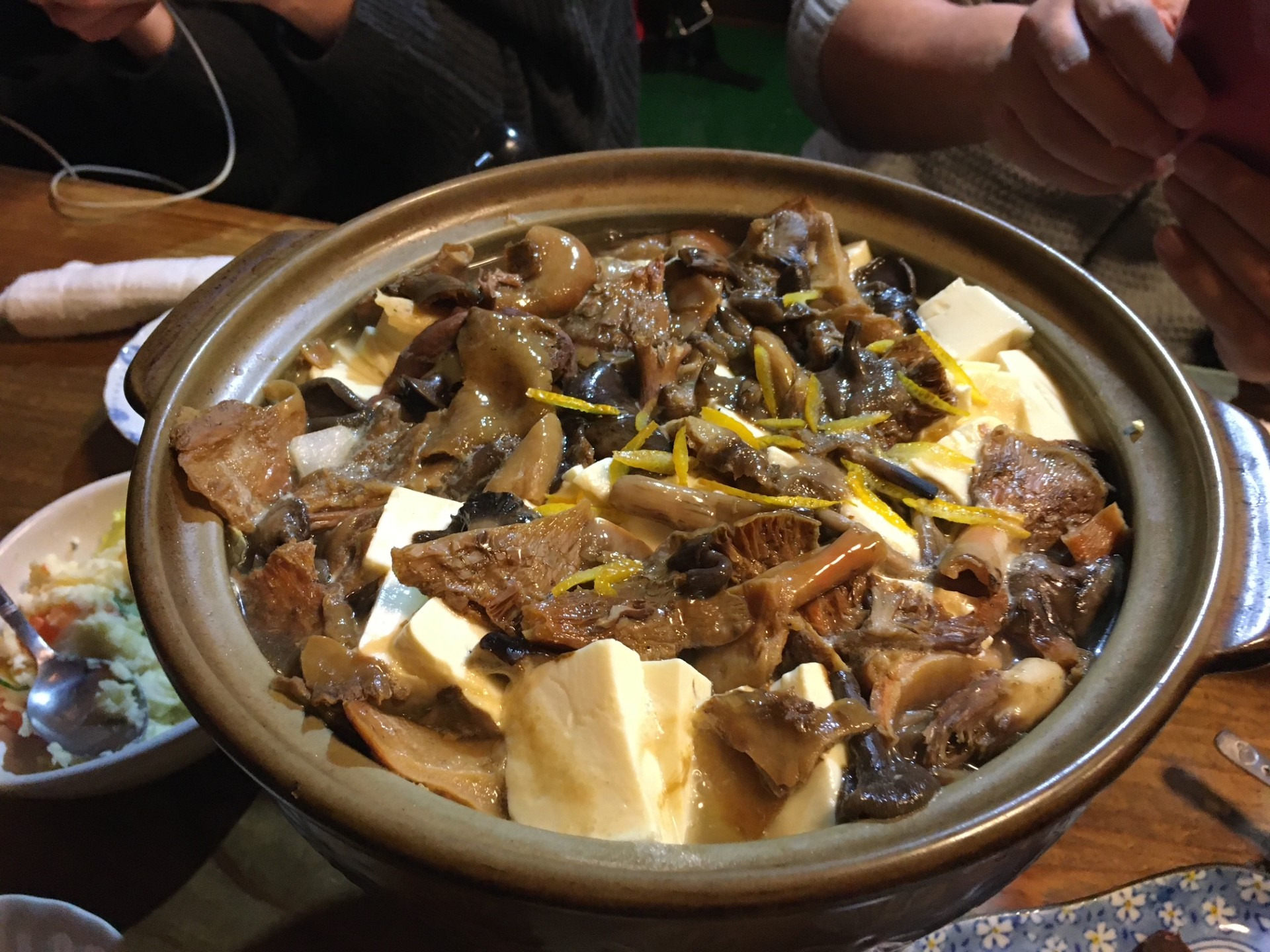 「酒場 庄助」冬の名物鍋。節子ママが近隣の山々から採取したあかもみだけやはたけしめじ、つばたけ、あみたけ、さくらしめじ、ほうきたけなどの天然きのこを茹でて保存。きのこと白菜と豆腐、鶏肉をすっきりとした出汁で煮た鍋を、炭火の七輪に乗せて運ばれてきます。運ばれたらすぐに食べられ、炭で保温されているのでいつまでも熱々で召し上がれます。