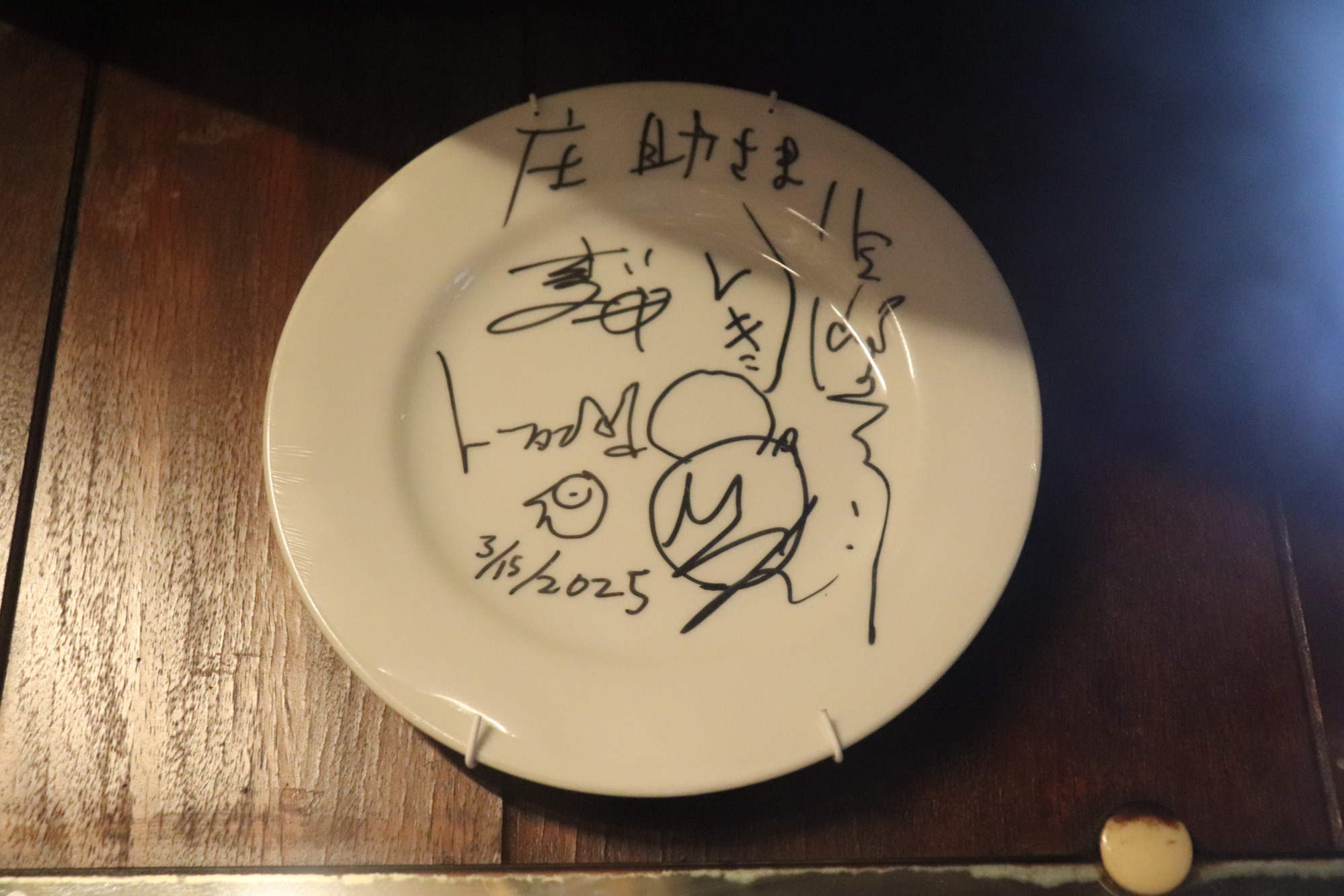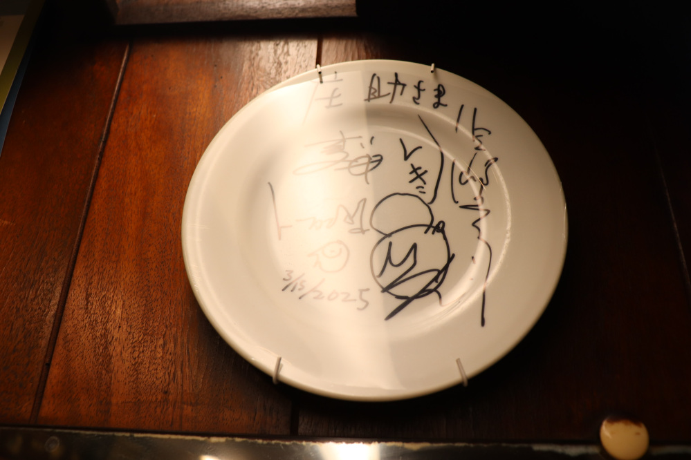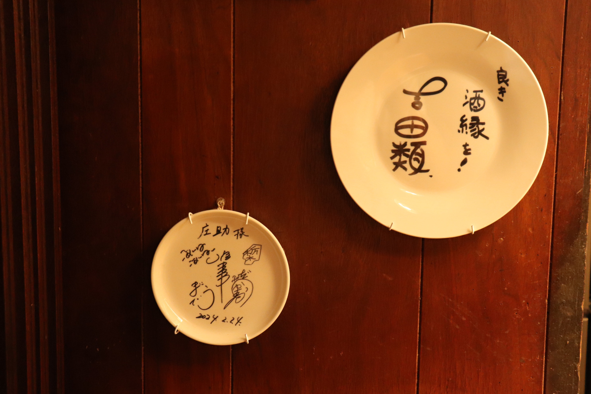 壁には「孤独のグルメ」にも常連客役で登場したU字工事のサインも飾ってあり、奥の壁にはライブの打ち上げで来店した浜崎貴司さん、奥田民生さん、トータス松本さん、レキシのみなさんの寄せ書きお皿サインが飾ってあります。