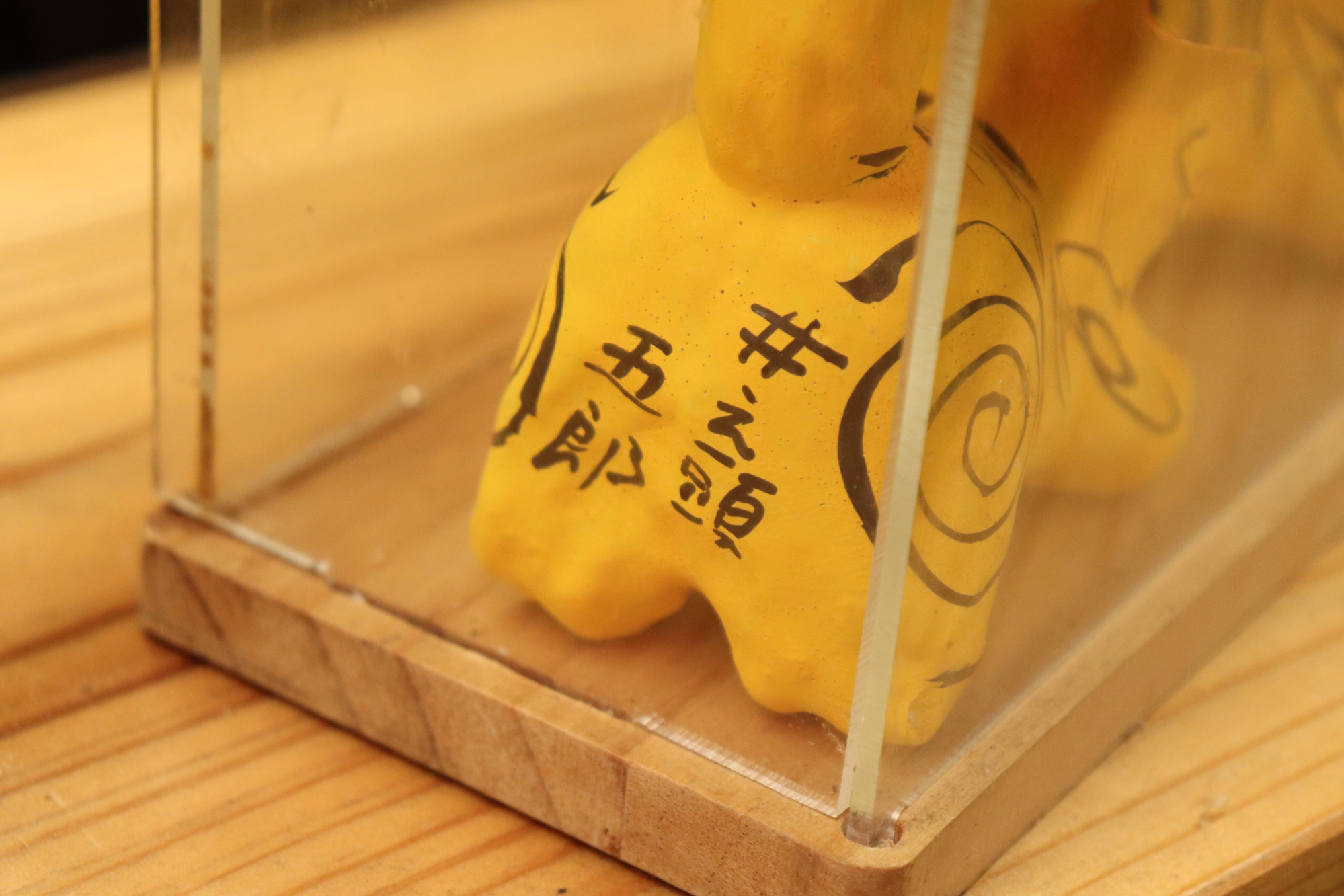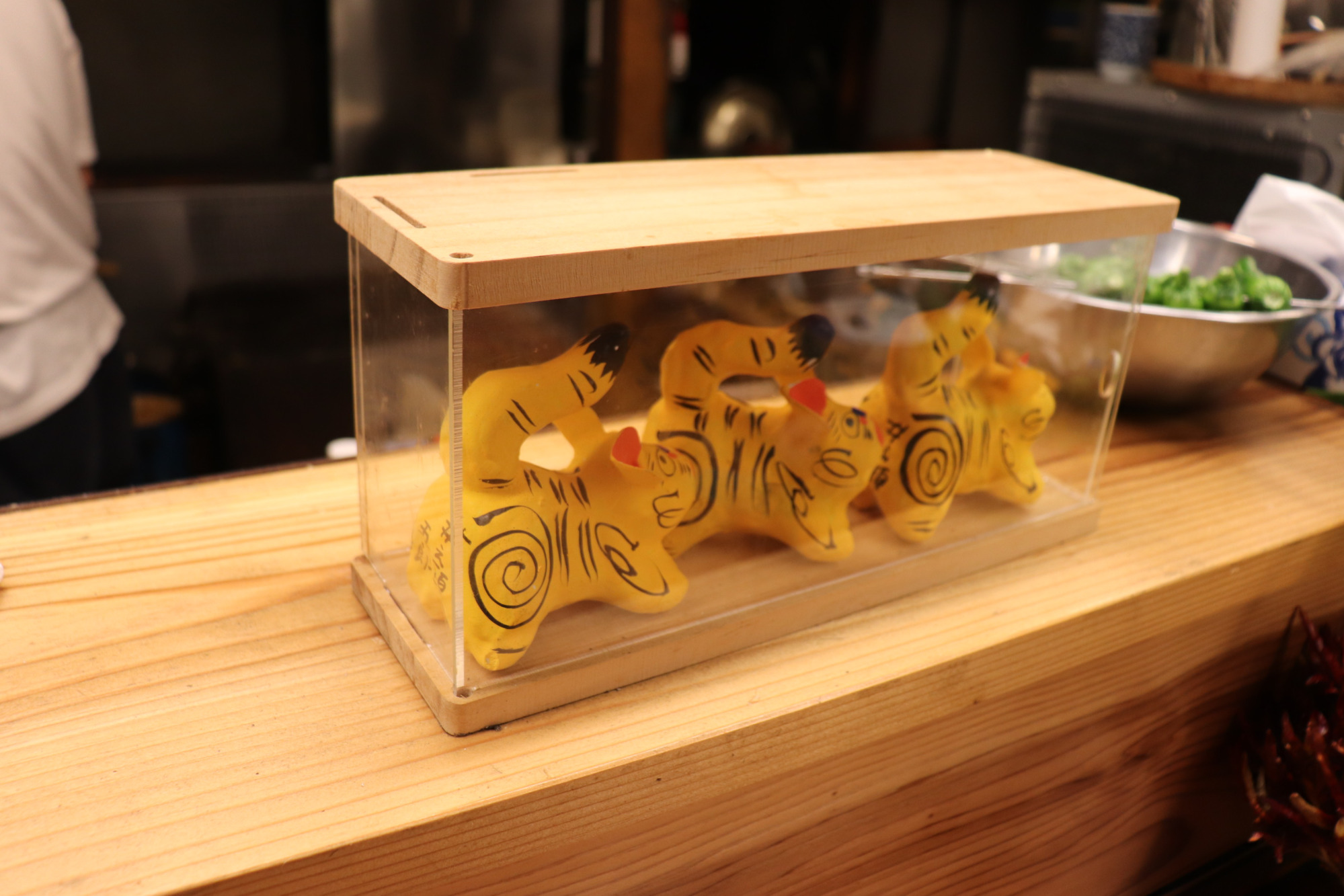 カウンターには番組で実際に使用した張り子の虎3匹が飾ってあります。よく見ると虎のおしりには松重豊扮する井之頭五郎さんのサインが!松重豊さんではなく、井之頭五郎のサインってところがレアです。来店の記念写真撮影に。