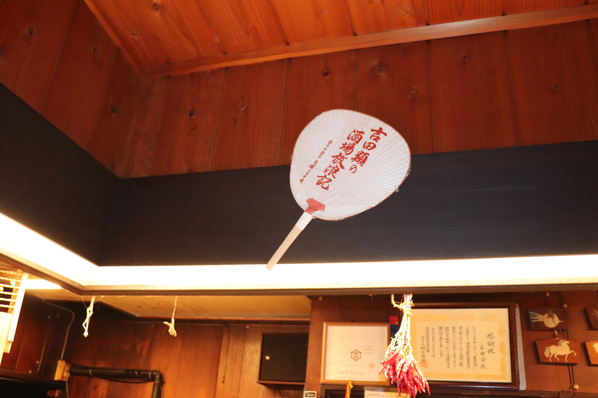 酒場詩人吉田類さんは「吉田類の酒場放浪記」撮影以外にもプライベートでも何度か来店しています。番組撮影時にいただいた番組名が入ったうちわが天井下に飾ってあります。また、入口右側の壁には「よき酒縁を」と書かれたお皿サインが。「酒縁」とは孤独死をするなど無縁社会となる現代において、酒場で酒を通じた縁でつながる「酒縁」を大事にして人と繋がり豊かな人生を楽しもうという吉田類さん提唱の言葉。「酒場 庄助」でよき酒縁を。