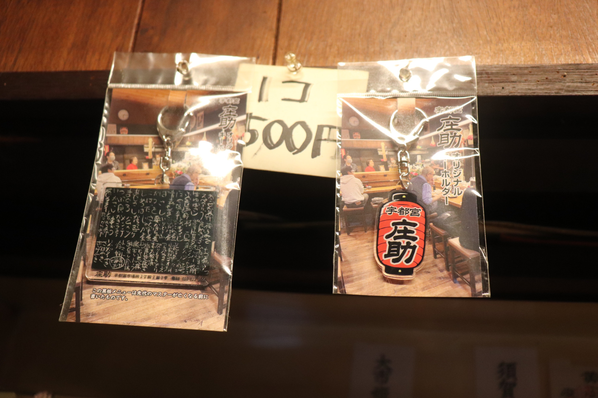 来店の記念になるようなお土産はないかとの問い合わせが多く、市内の印刷屋からの助言で、「酒場 庄助」の提灯と先代のマスターが書いたメニュー黒板をアクリルキーホルダーにして販売しています。2種類それぞれ1個500円(税込)。