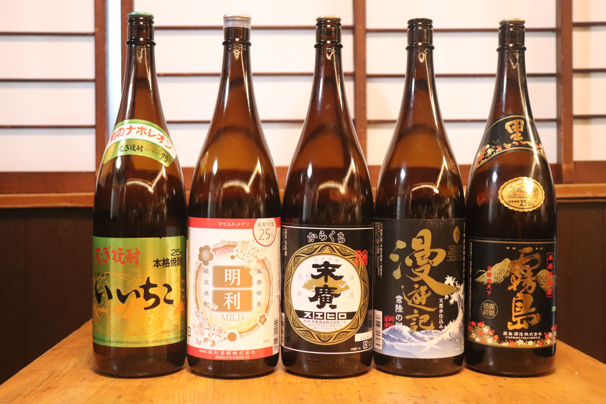 焼酎の種類は、麦焼酎が「いいちこ」、芋焼酎は「黒霧島」か茨城県産「漫遊記(まんゆうき)」。茨城県は干し芋の名産地ゆえに芋焼酎も美味しいです。注文時にロック、水割り、炭酸割り、お湯割りと好みの呑み方を。