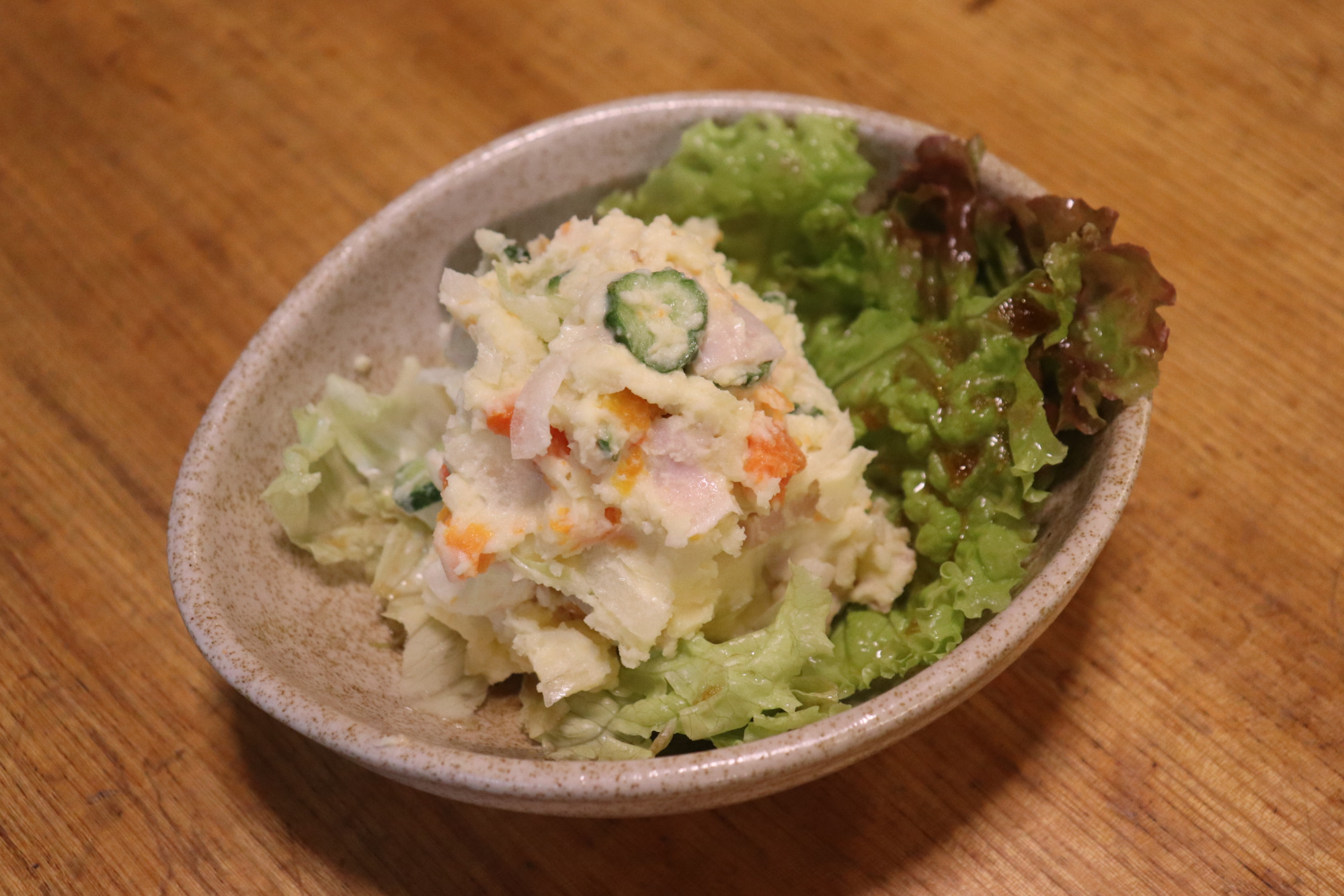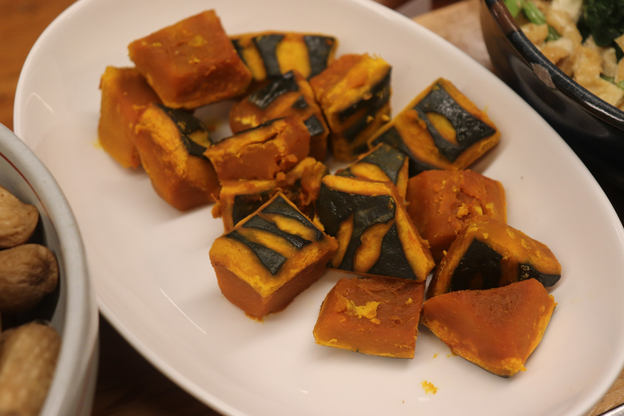 カウンターの大皿料理。庄助ではマヨネーズが添えられます。かぼちゃの甘みとマヨネーズがクリームチーズのような味でスイーツのように。