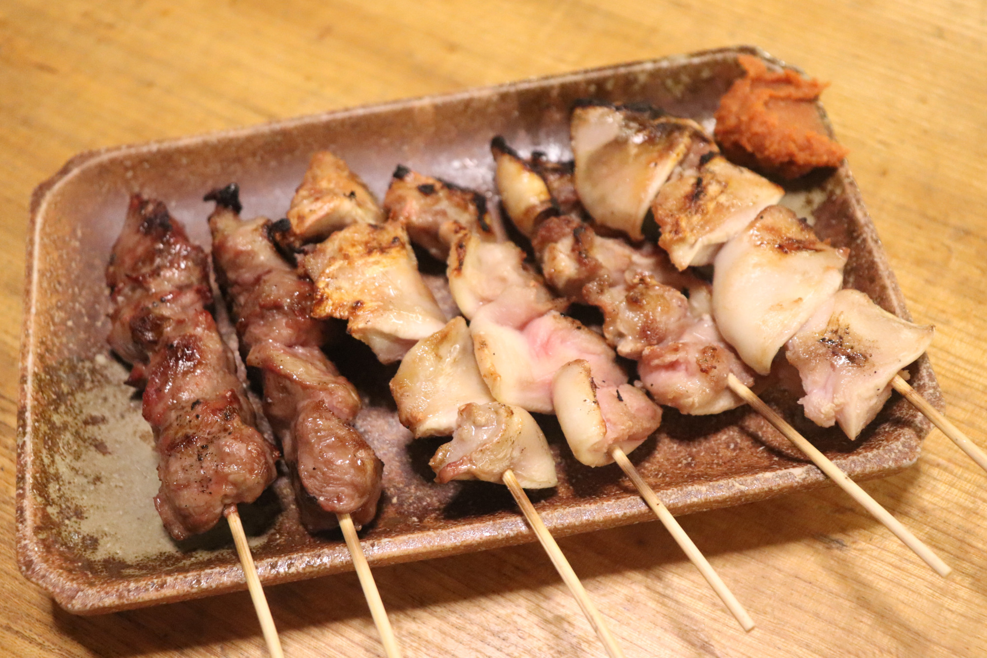 ネギマ(鶏)、皮(鶏)、ぼんじり(鶏)、レバー(鶏)、ハツ(豚)、タン(豚)、カシラ(豚)、ナンコツ(豚)の部位から選べます。