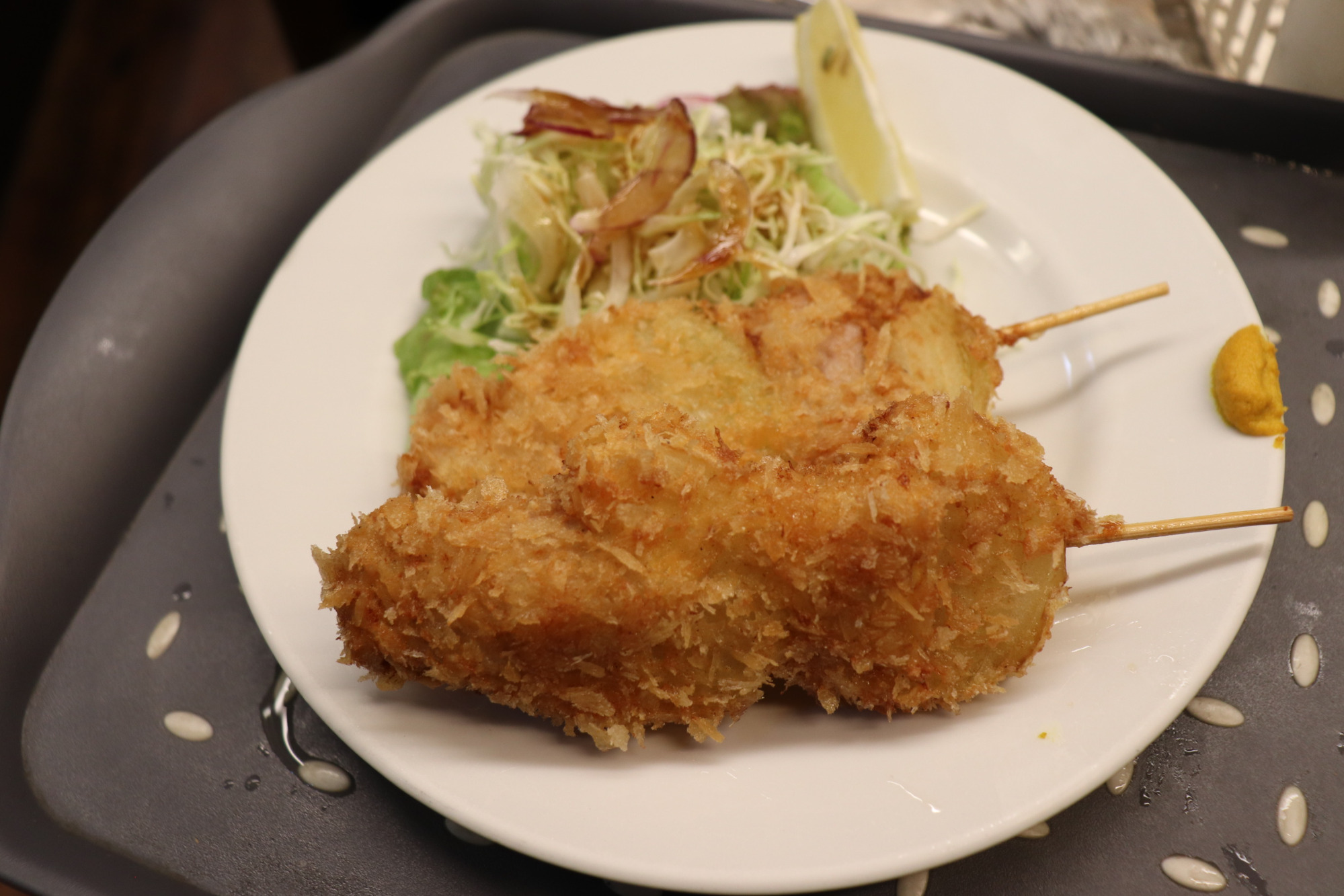 タマネギと豚ヒレ肉を使用したボリューミーな串カツ。