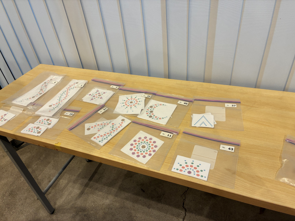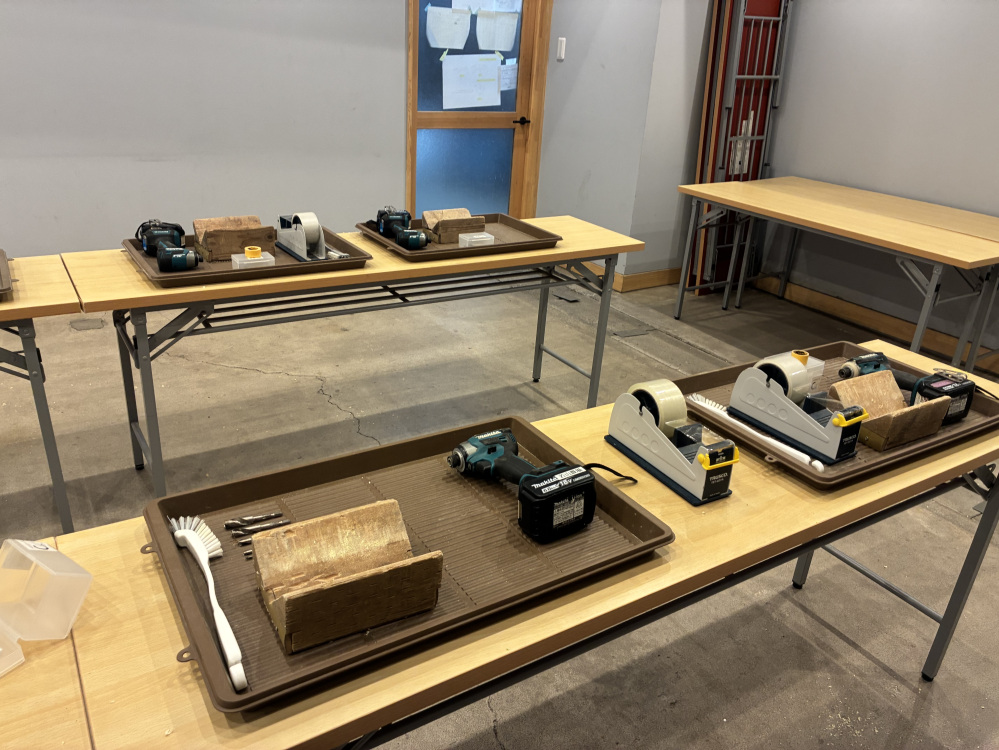 展示を堪能したところで、今回のメイン・竹あかり制作体験へ。会場に入ると、大きさも太さもさまざまな竹が並び、テーブルには工具が置かれてました。