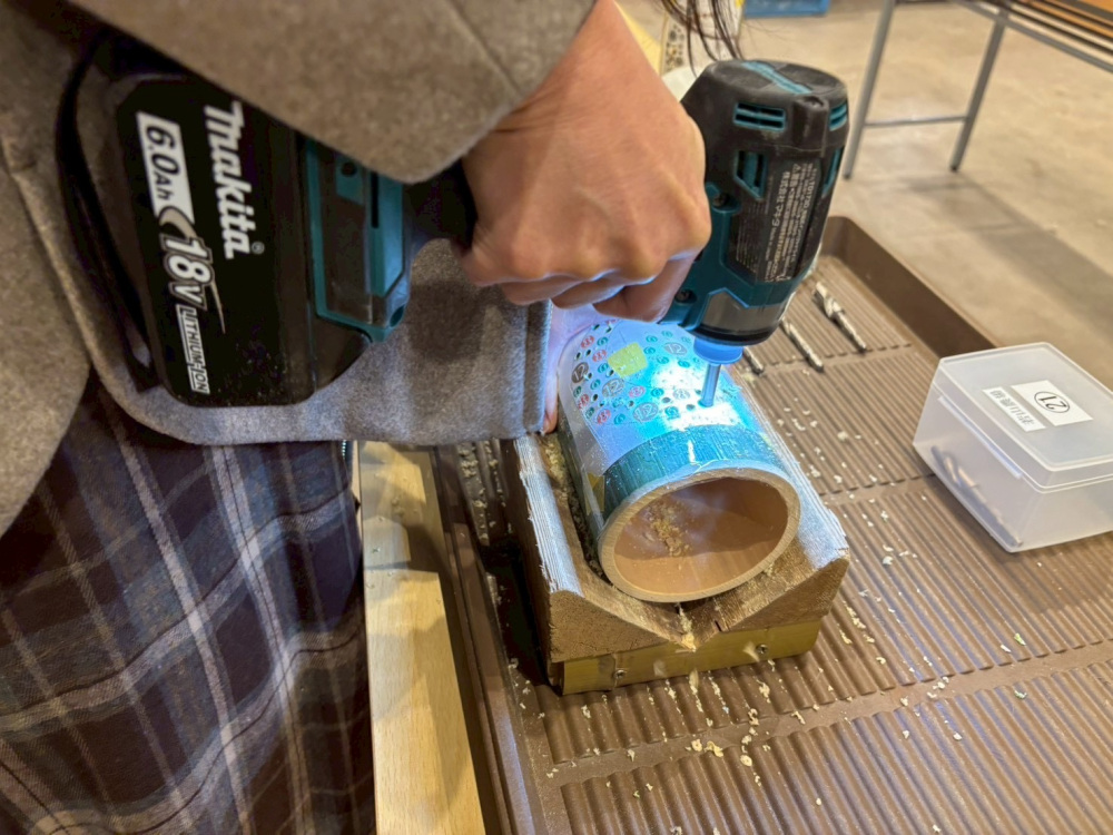 穴をひとつ開けるごとに竹の粉が舞い、指先にほんのり振動が伝わる心地よさがあります。