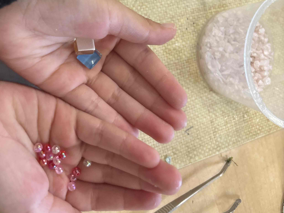 きらきらしたビーズから、立体的なボタンやきれいな石など様々な材料が入っています。