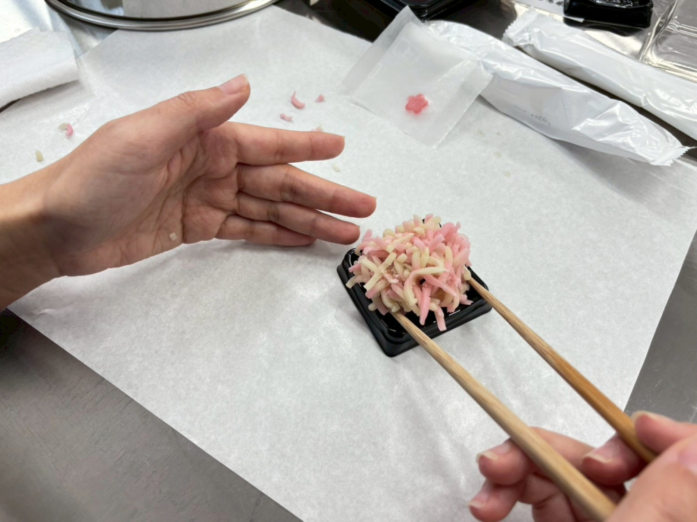 紅梅の和菓子作り。花びらの表情をつくる工程