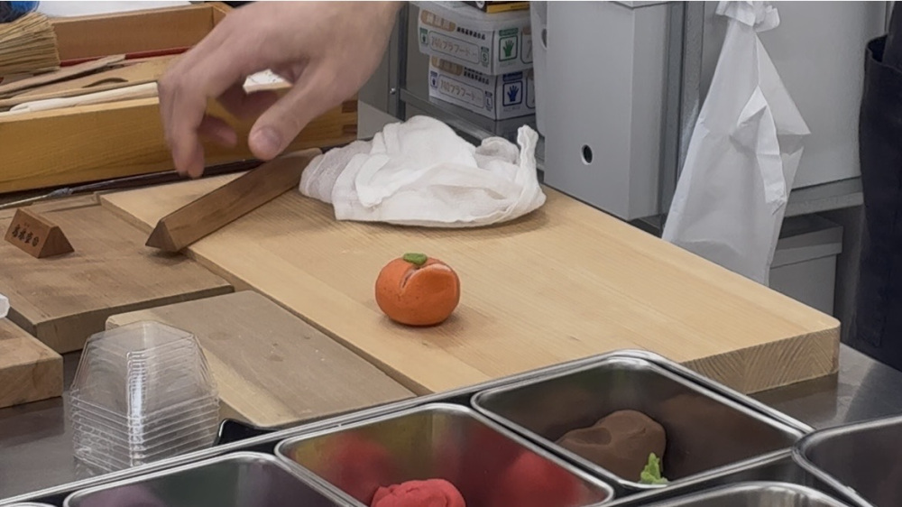 目の前で、みかんの和菓子や、「松・竹・梅」をひとつで表現する和菓子を作ってくれました。