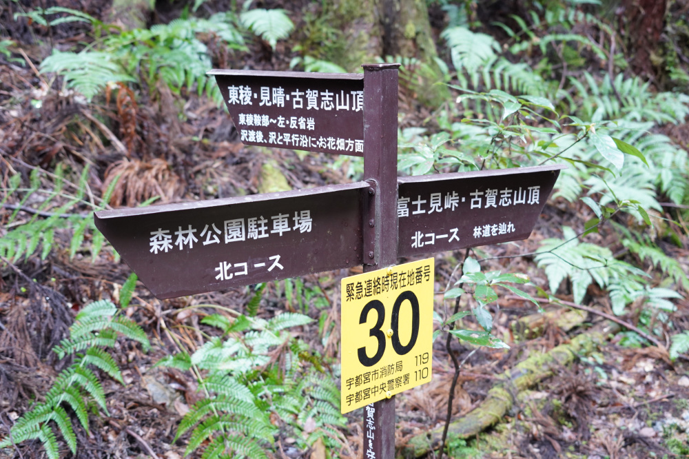 丸太階段を登ったら、分岐点。「北コース(富士見峠・古賀志山頂方面)」を離れ、「お花畑コース(東陵・見晴・古賀志山頂方面)」へ。
