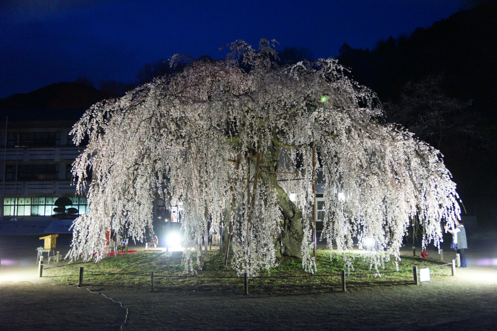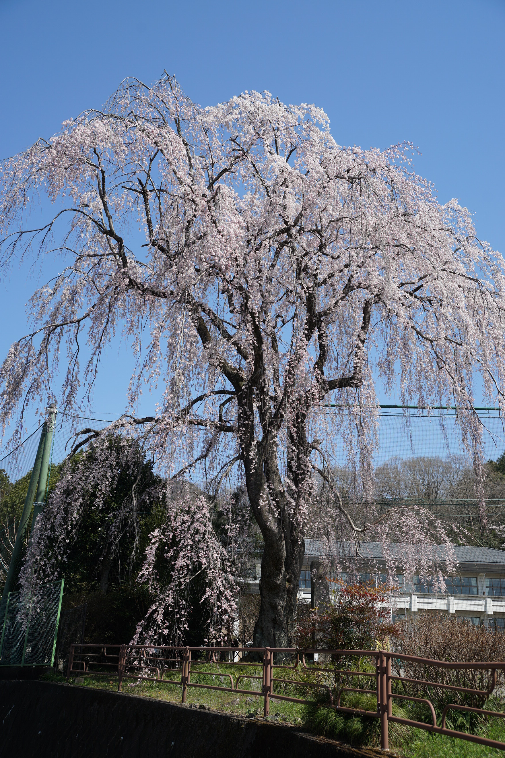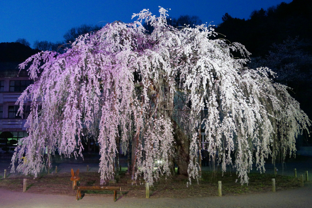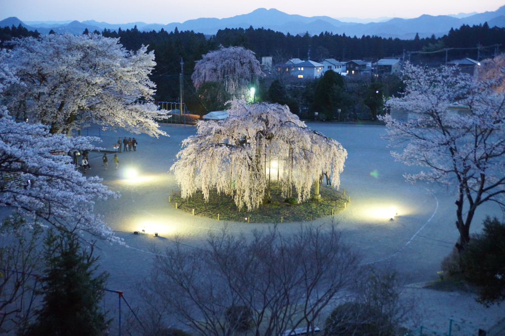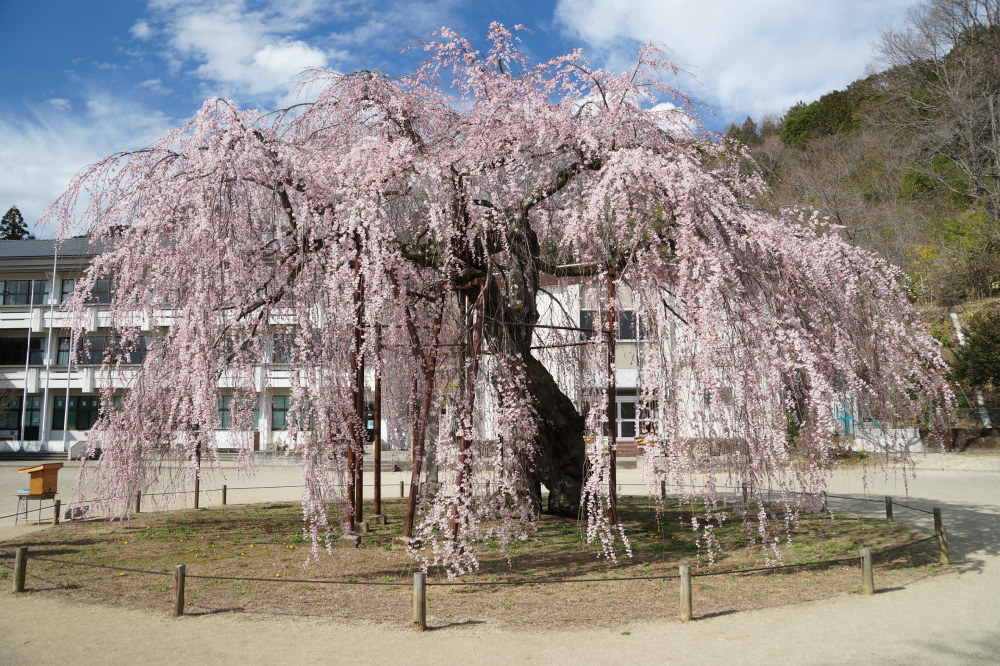 城山西小学校の校庭に咲く樹齢約450年のシダレザクラは民話「孝子桜」として有名です。以前は校庭が開放されていましたが、近年ではイベント開催日のみ開放されます。例年3月下旬頃に咲き始め、4月上旬頃に見頃をむかえます。