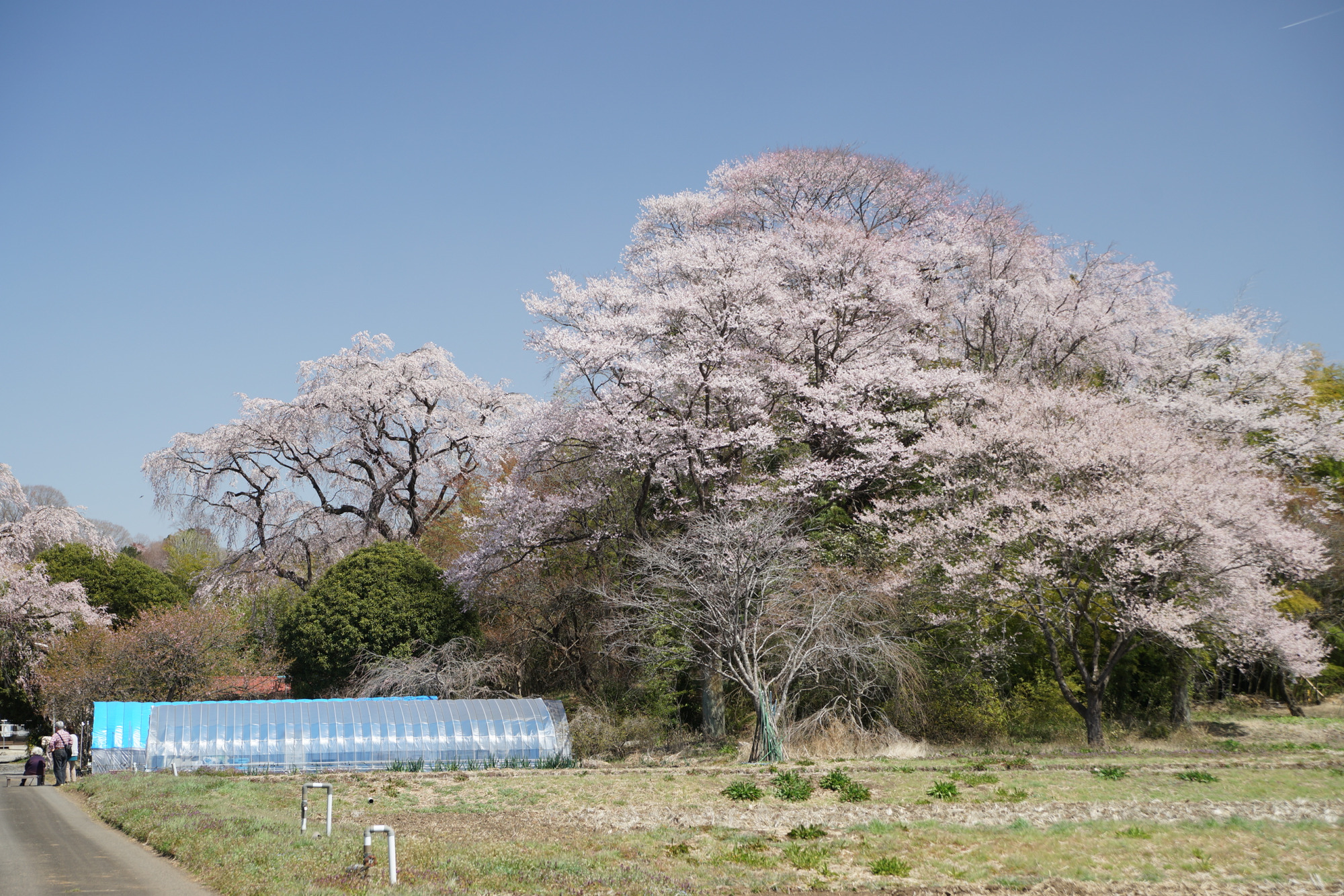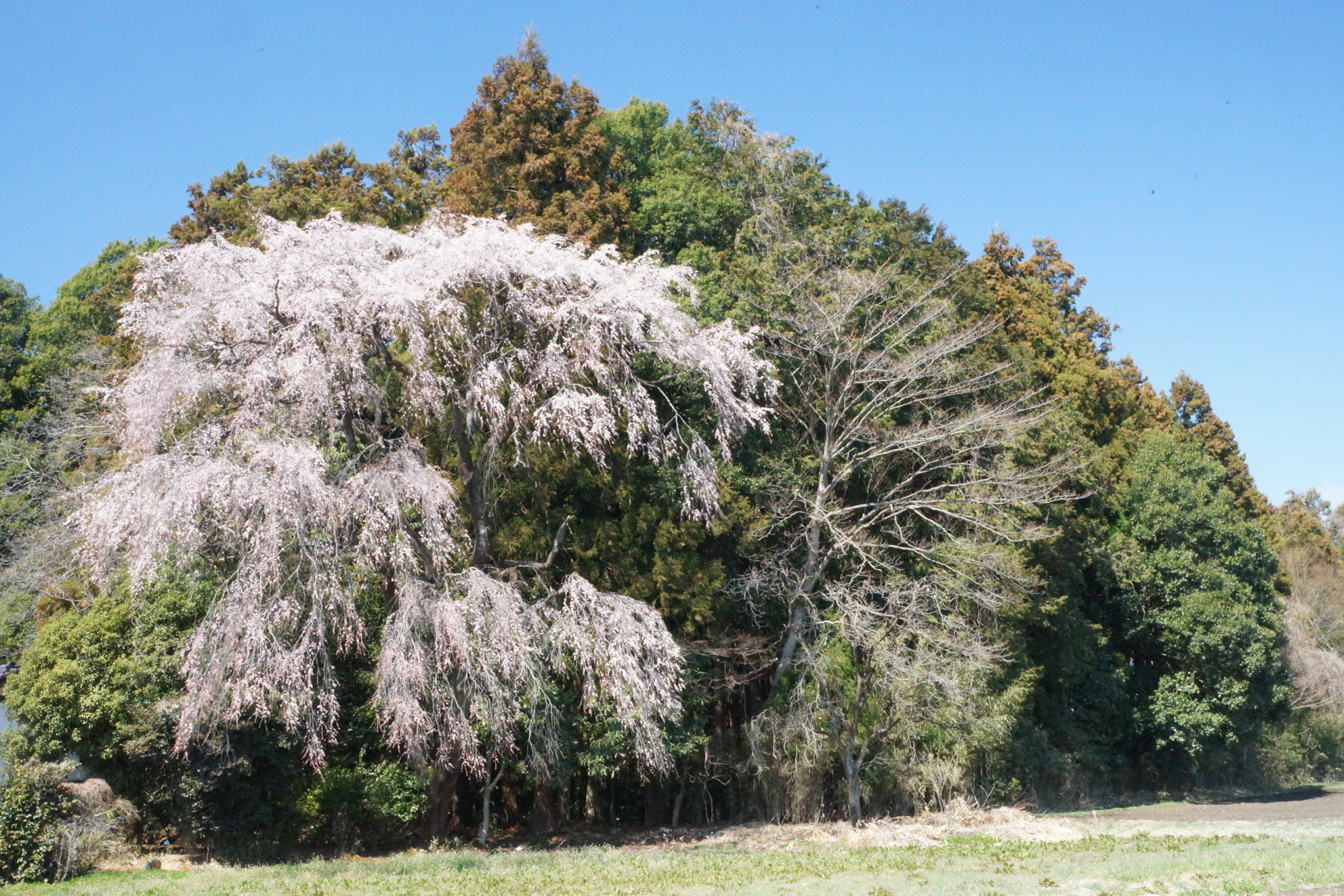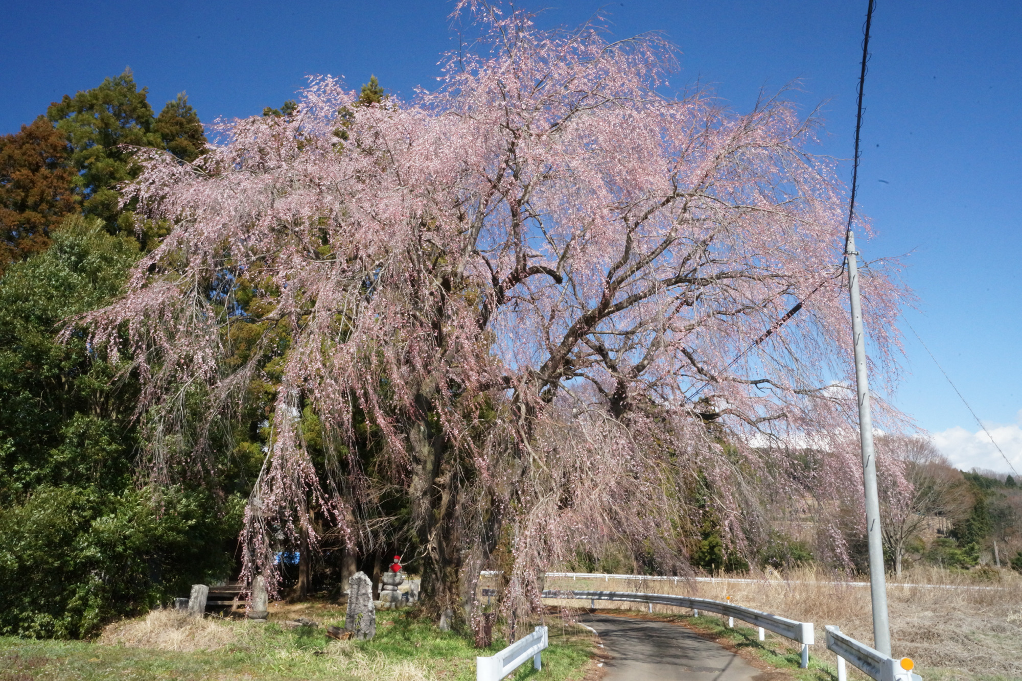 県道70号線に接し、パラグライダーハウスの近くにある田野邊家のシダレザクラは、城山西小学校の孝子桜の子どもで、1971(昭和46)年に植えられたものであり、樹勢は旺盛です。