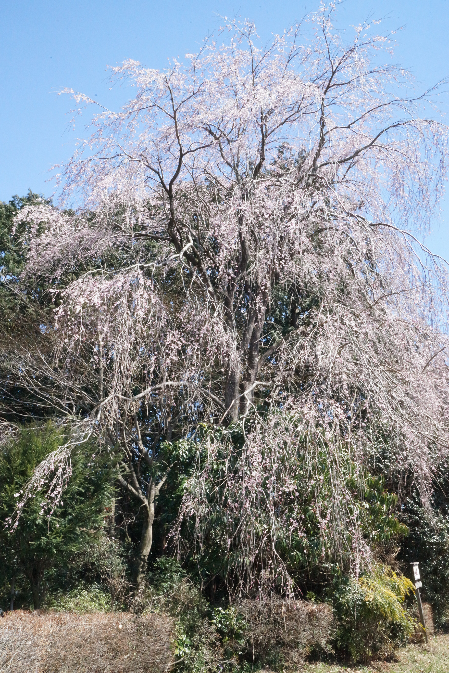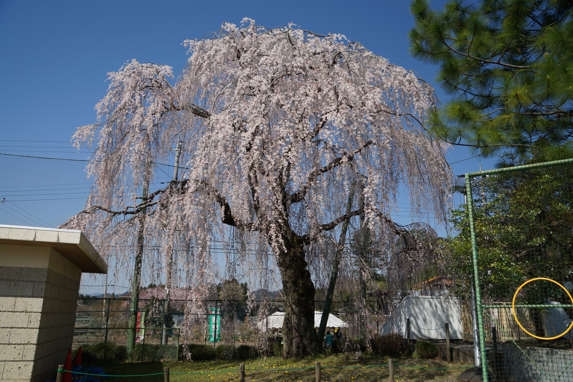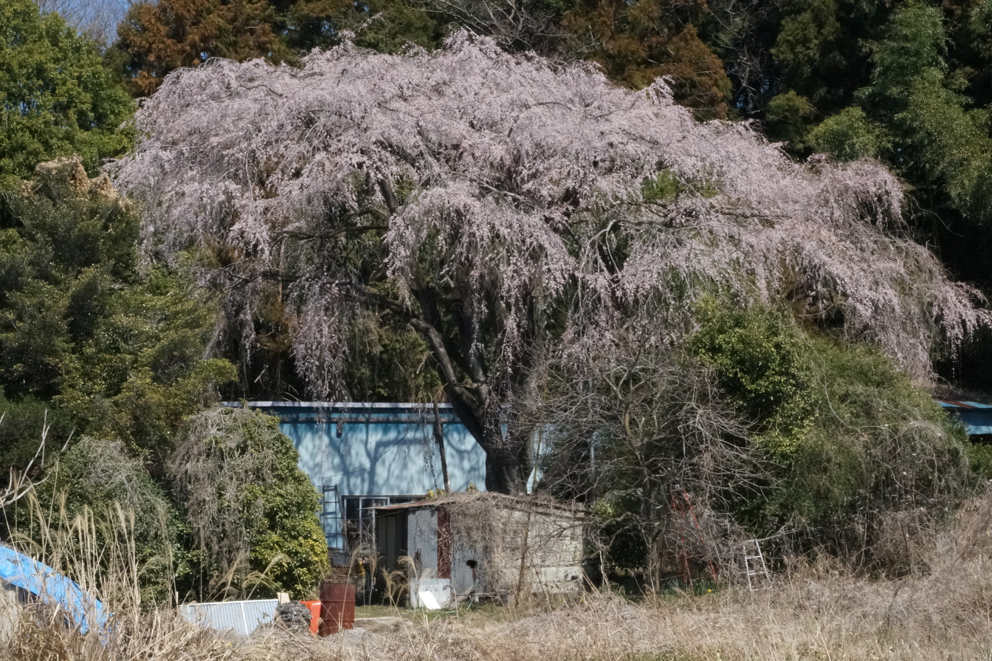 県道70号線に接し、パラグライダーハウスの近くにある田野邊家のシダレザクラは、城山西小学校の孝子桜の子どもで、1971(昭和46)年に植えられたものであり、樹勢は旺盛です。