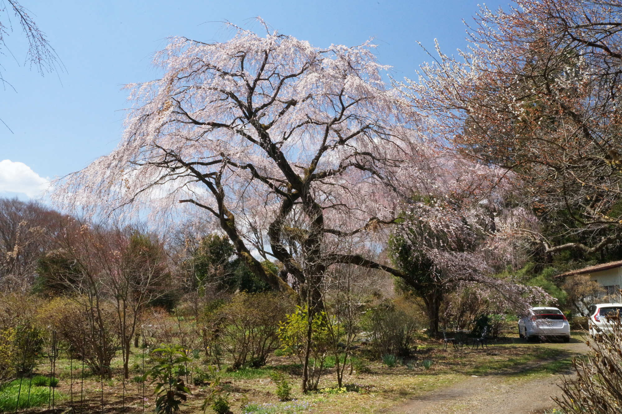 高さ18m、目通り周囲2.5m、樹齢は約220年といわれています。古賀志山を背景に、母屋の前には大きなものだけでも8本の桜が咲き誇り、見事な景観を呈しています。