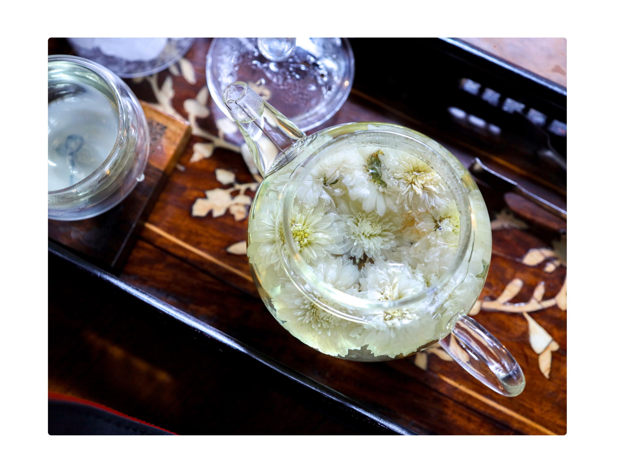 わたしが今回選んだ花茶「菊花茶(きくかちゃ)」は、ガラスの急須に花が浮かぶ、見ているだけで気分が上がる華やかなお茶。