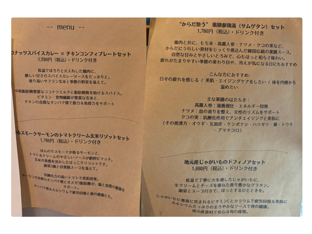 ランチメニューは季節のパスタや石川はちみつ牛ハンバーグ、キーマカレー、台湾屋台セット、トルティーヤなど種類が充実。