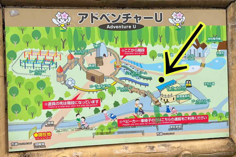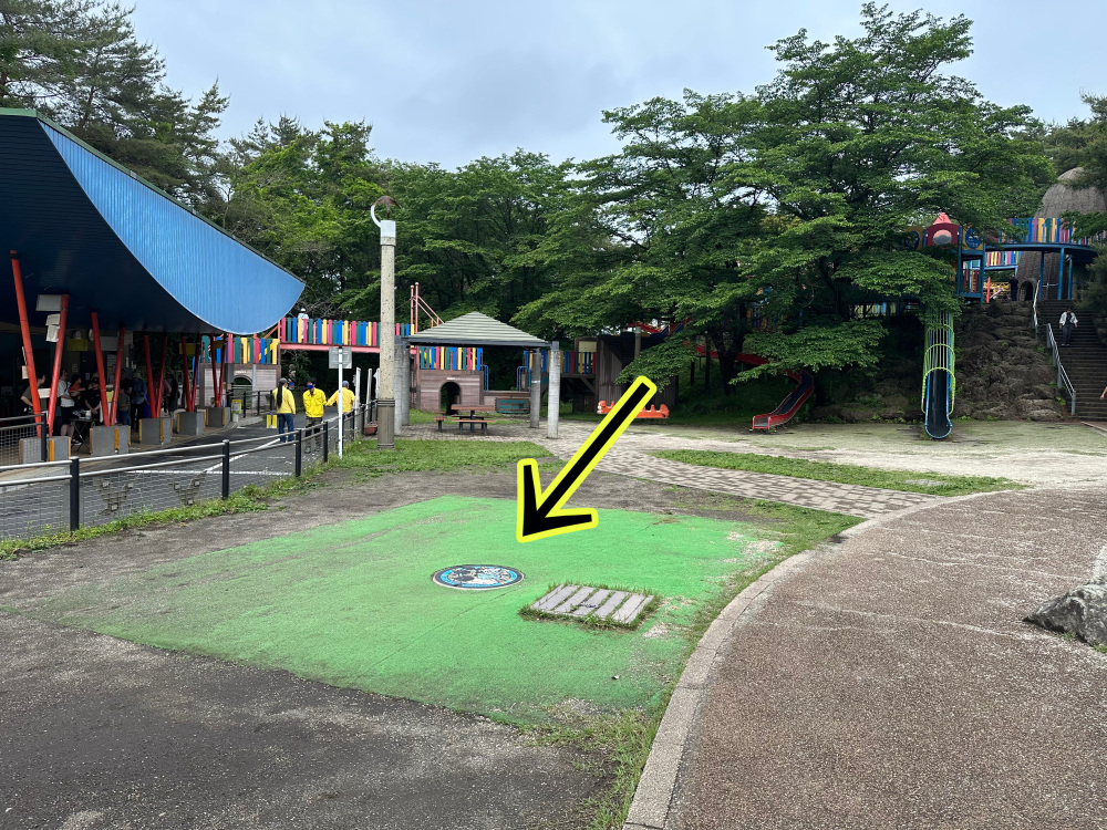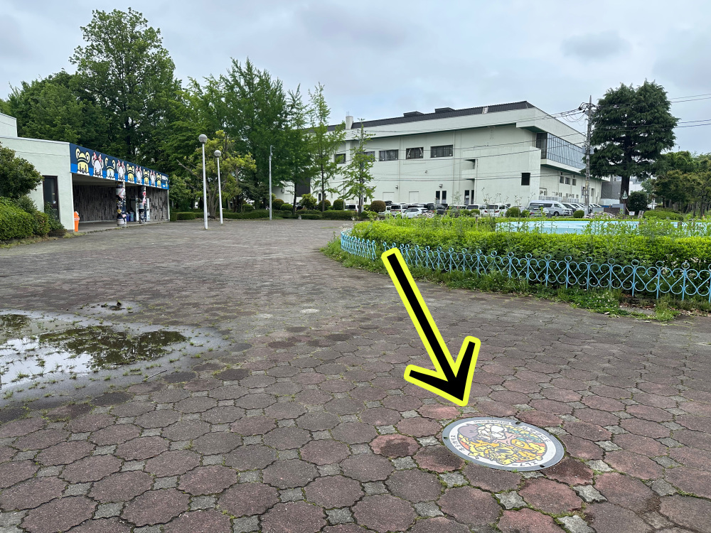 マンホール蓋が設置されているのは、八幡山公園内アドベンチャーU(ゴーカートのりば前)です。