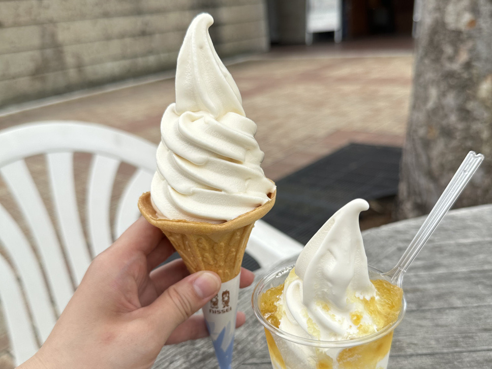 デザートに、お店のすぐそばに売っていたご当地ソフトクリームも食べました。宇都宮の宮ゆずをたっぷり使ったソフトと、レモン牛乳のソフトがありました。どちらもご当地限定ソフトなので、ここでしか出会えない味かもしれません。