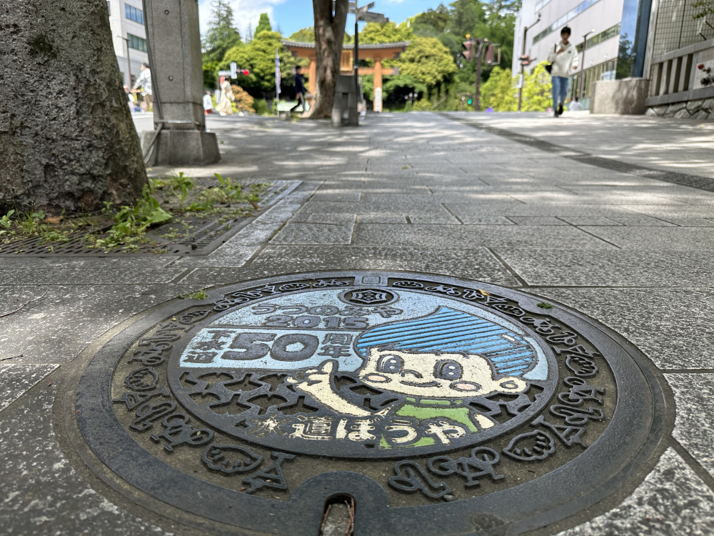 車で移動して実際のマンホール蓋を見てきました!目印は宇都宮二荒山神社で、神社正面のバンバ通りに水道ぼうやのマンホール蓋を発見 。歩道(ドン・キホーテと反対側)なのでじっくり眺められました。車は近隣のパーキングを利用しました。