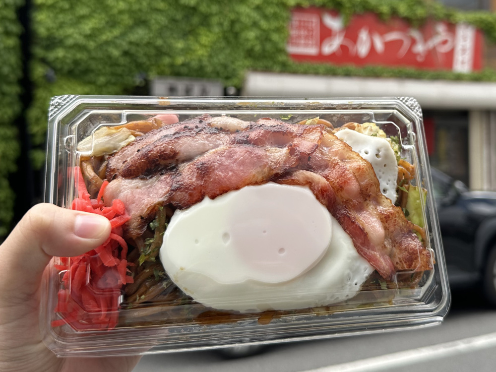 マンホール蓋から餃子通りをまっすぐ進んで突き当りを左に曲がった場所にある「やきそば あかつきや」。シンプルな焼きそばも美味しいですがトッピングで自分好みにカスタムすることもできます。人気のトッピングは、ベーコンとたまご(写真)!追いソースが付いてくるのも特徴です。太麺で美味しい焼きそば、ぜひ食べてみてくださいね