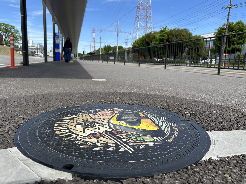 このマンホール蓋は、ライトライン(LRT)開業を記念して2024年に設置開始されました。ライトラインのトータルデザインコンセプト「雷都を未来へ」から、雷や恵みの稲穂のイメージも取り入れて作成した記念のロゴマークをもとに、ライトラインで街が色付く様子が描かれているそうです。